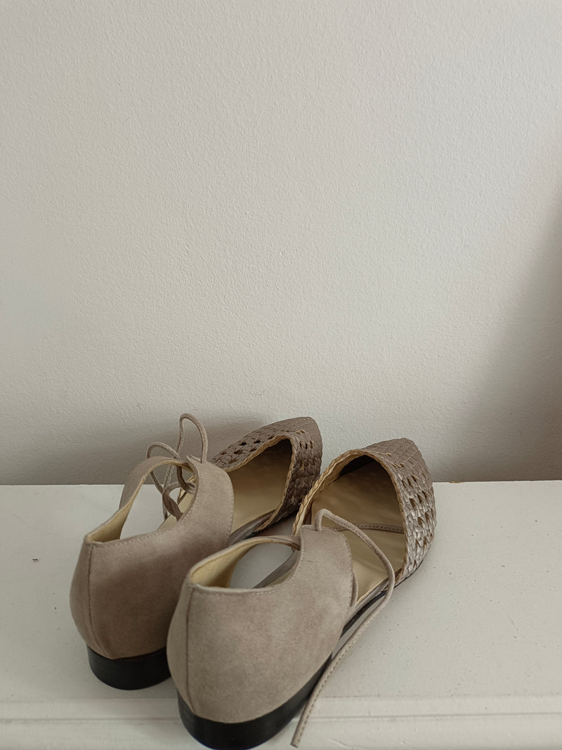 SIN ESTRENAR. Bailarina plana grises y plateados con cordón troquelados