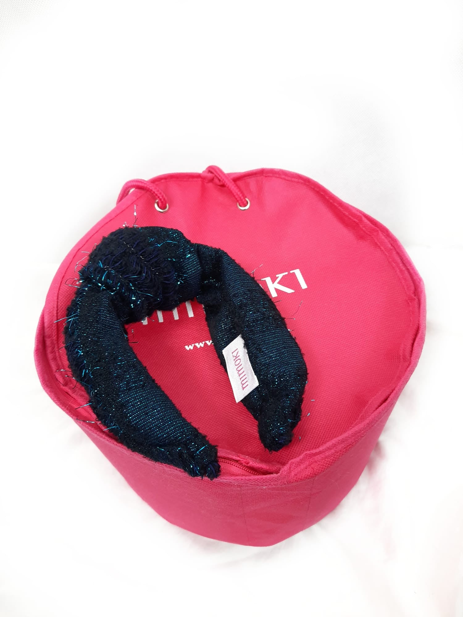 Tocado estilo diadema con nudo en tonos azules y negros.