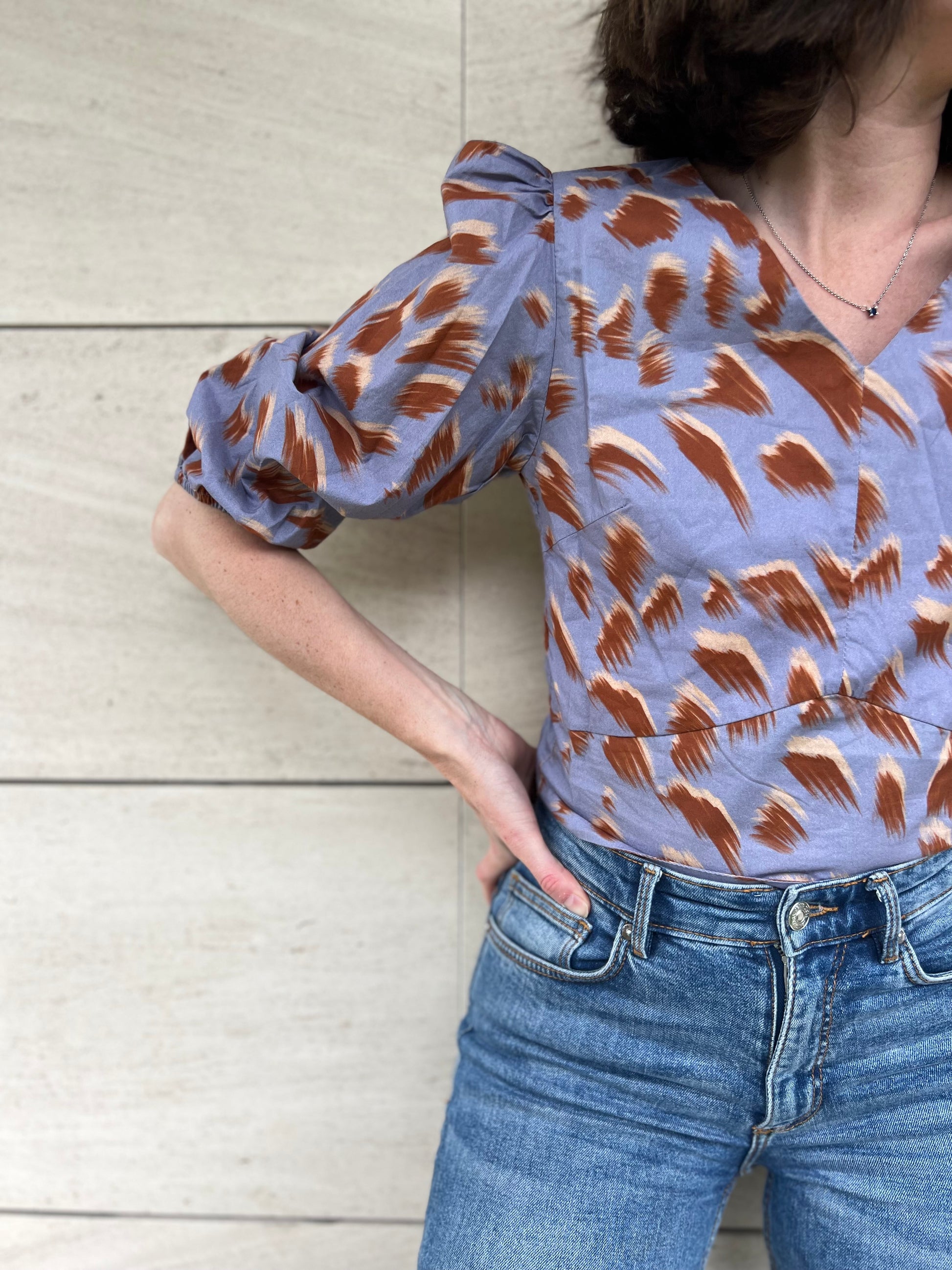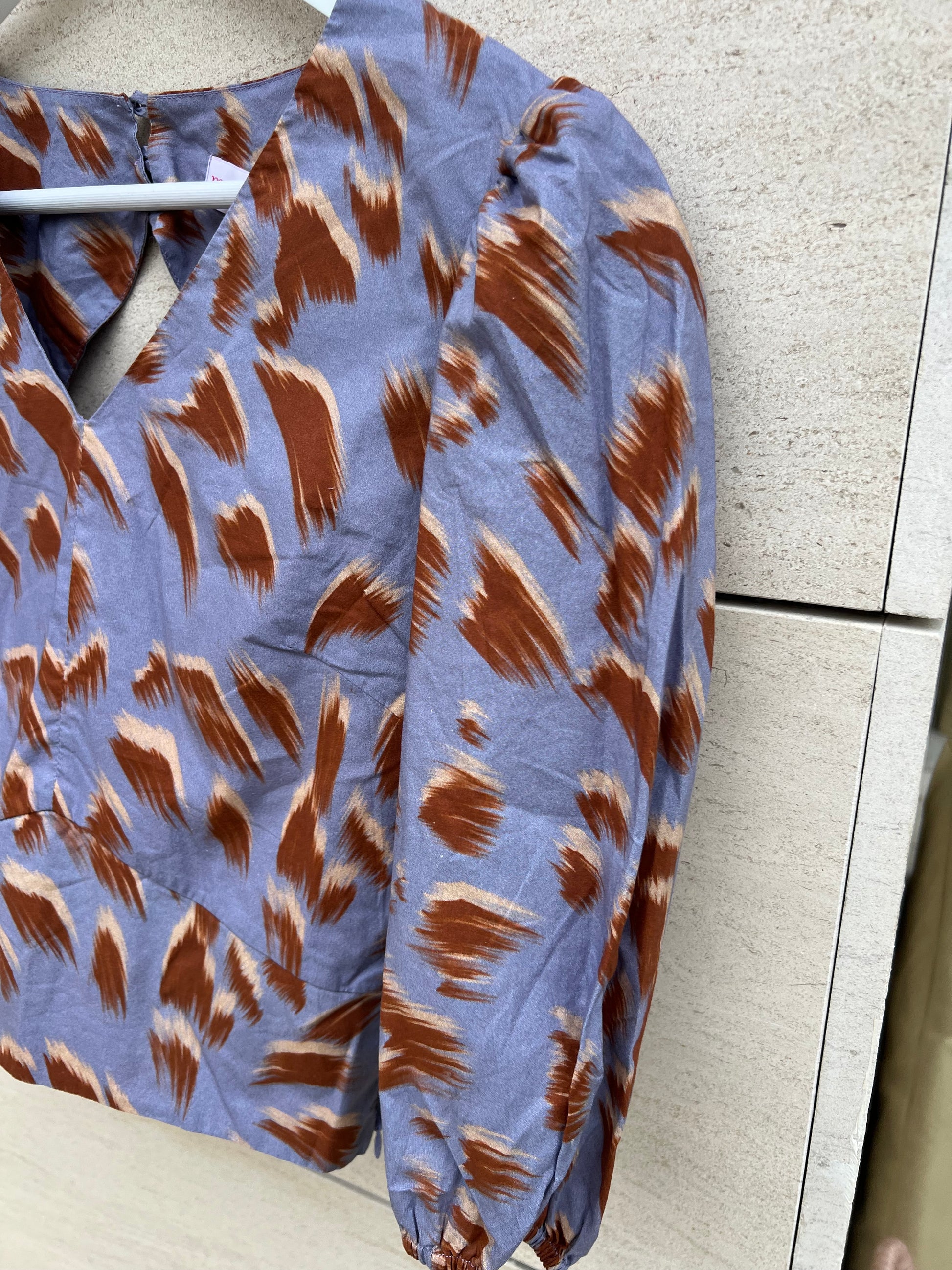 top morado estampado abertura . Espalda 44cm, largo 43cm. No elastico