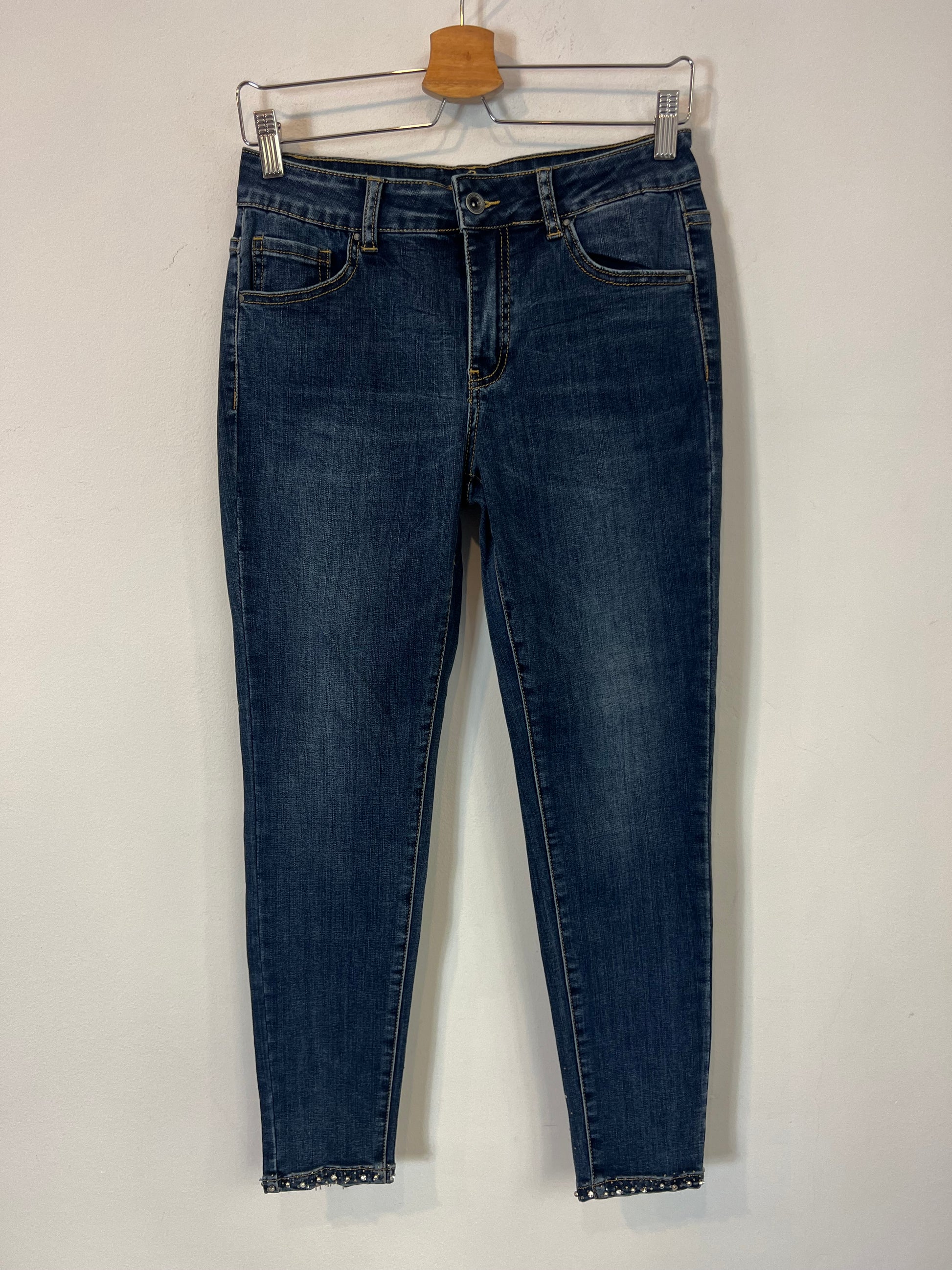 Denim pitillo detalle abalorios en el tobillo. Cintura 38 cm, largo 93 cm. Semi Elástico. Talla 44 en etiqueta