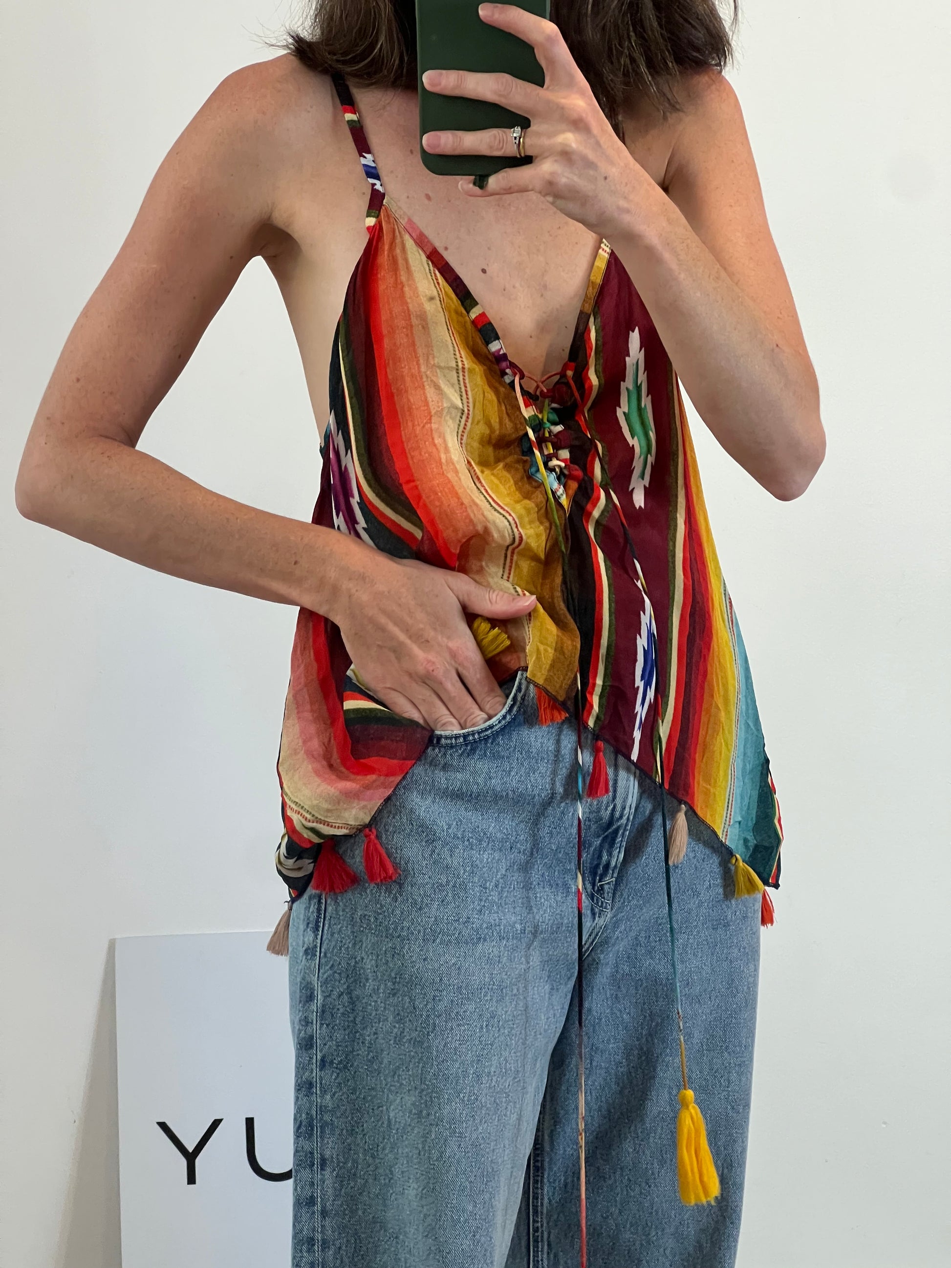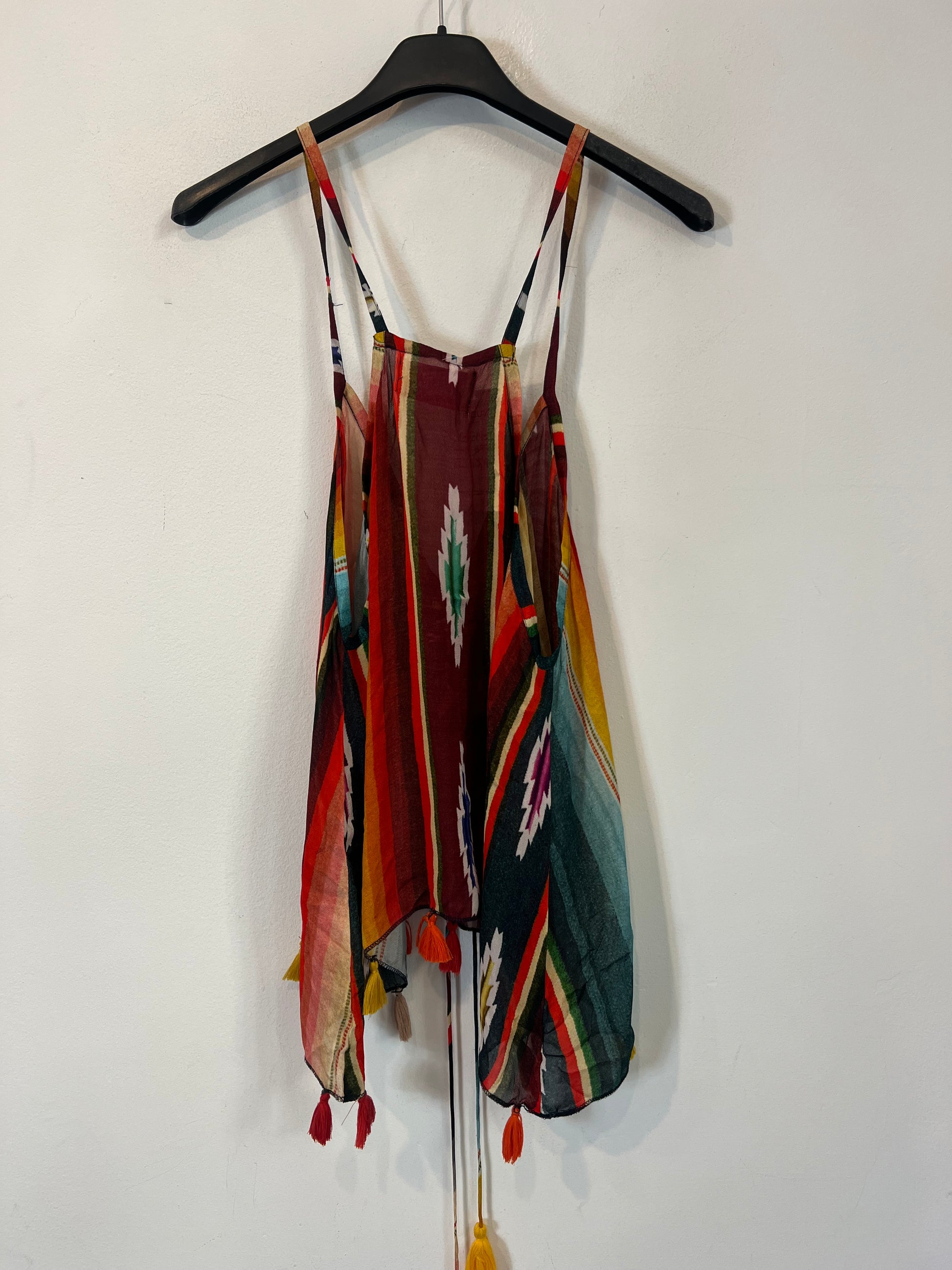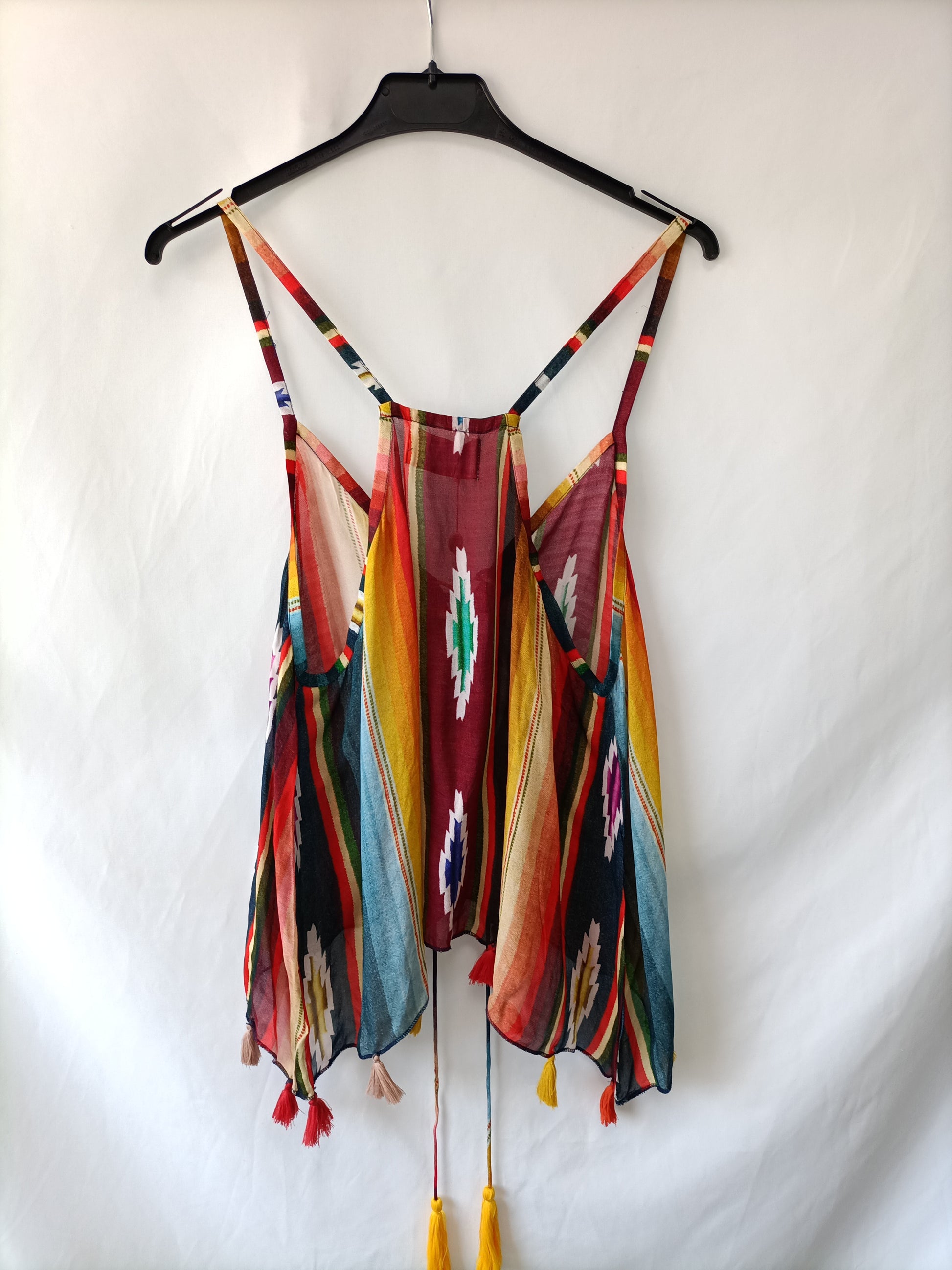 Top étnico de colores con borlas. Semientransparente. No elástico. De sisa a sisa 51 cm Largo 64 cm