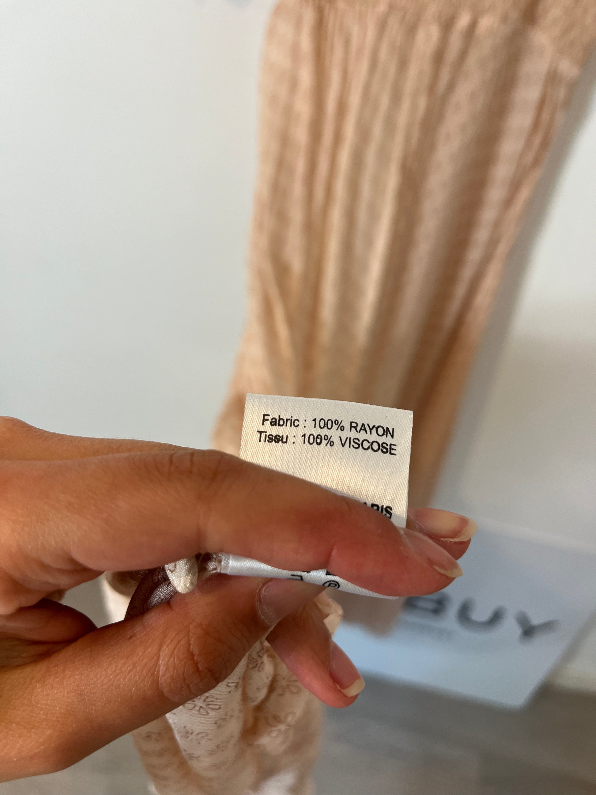 Trae un botón extra. Cintura elástica. Largo 139 cm, de sisa a sisa 49 cm.