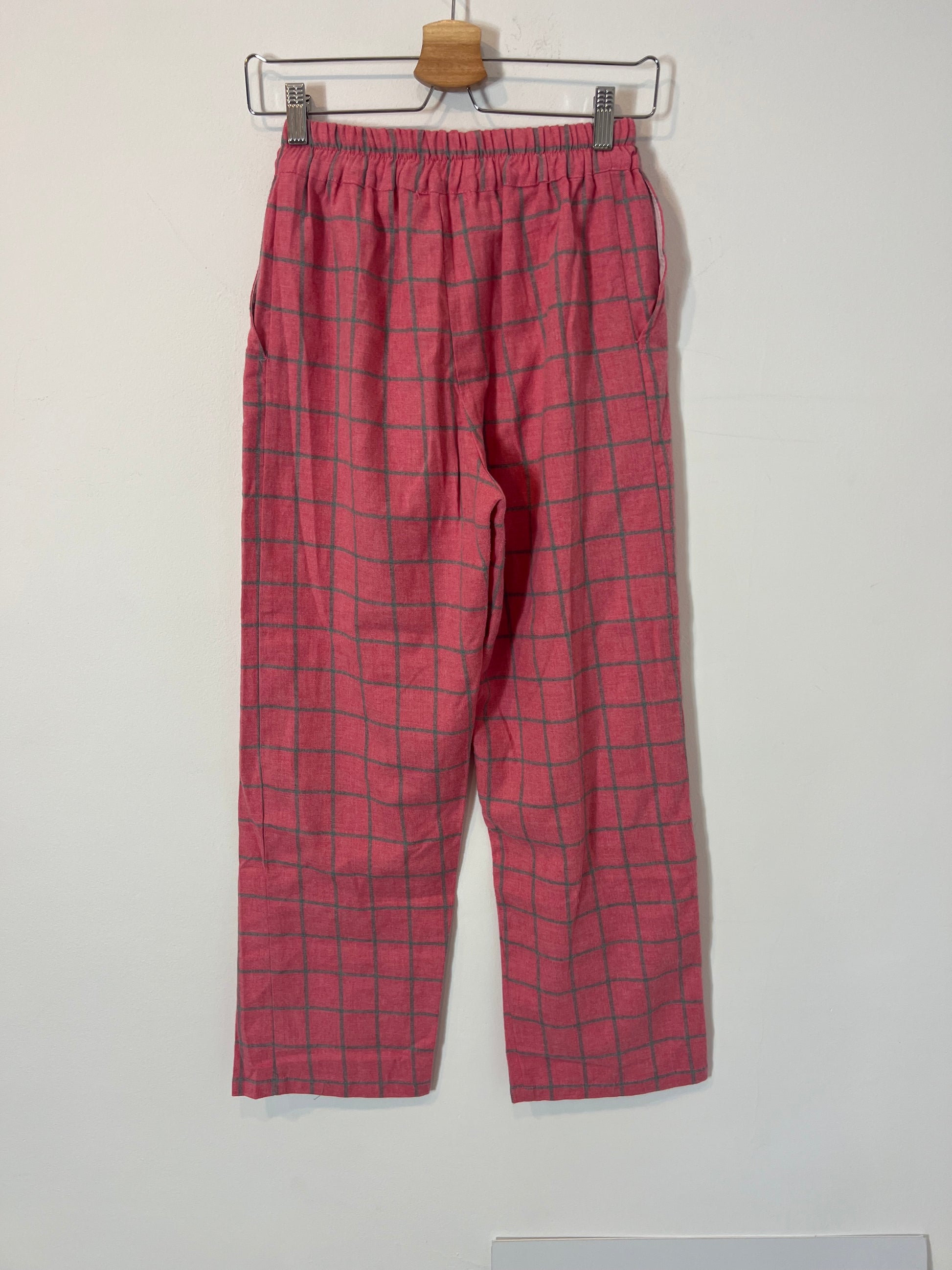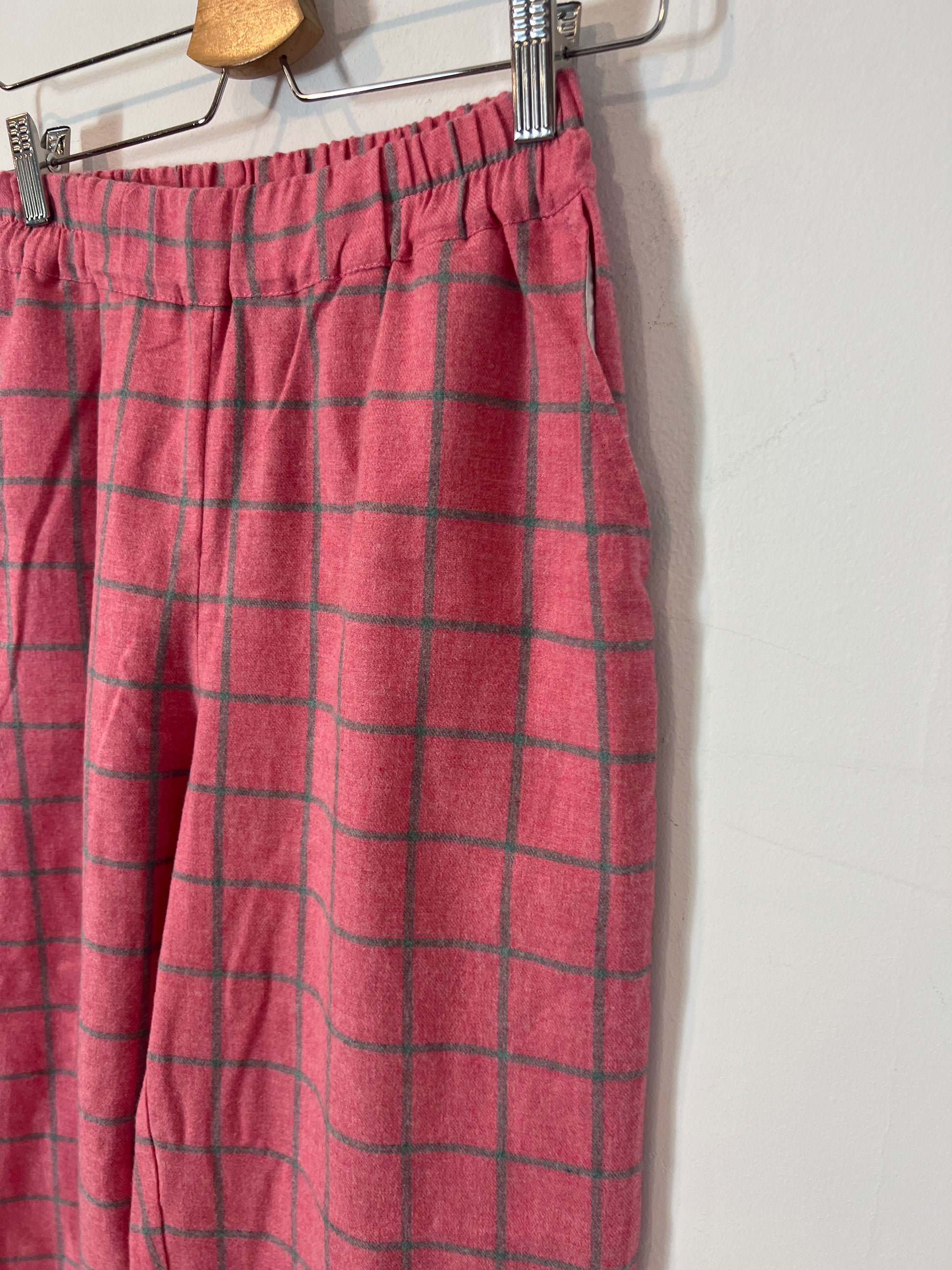 Pantalones rosas con cuadros grises. Anchos cintura elástica 34cm, largo 98cm
