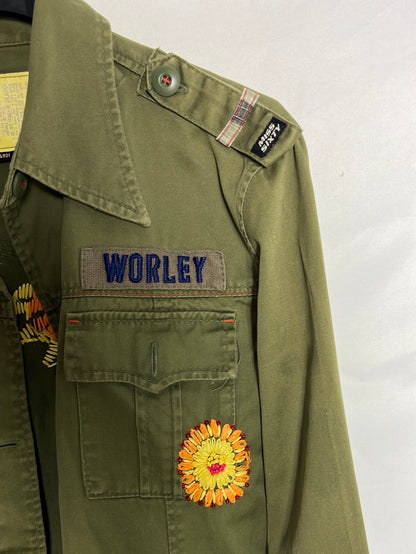 Camisa verde bordados estilo militar. Hombros 40cm, largo 59cm