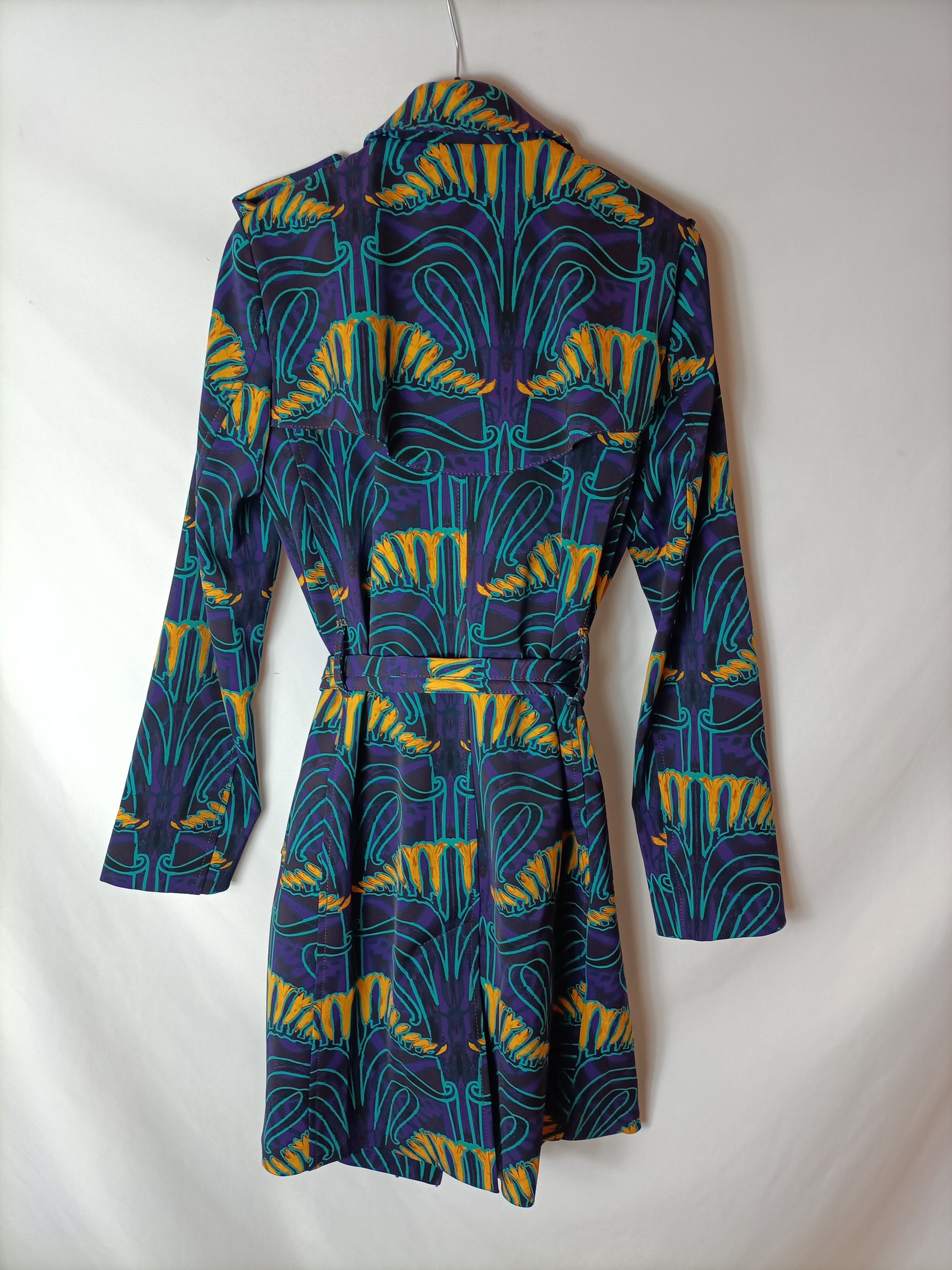 Gabardina estampada . Fondo burdeos y morados. Forro interior morado