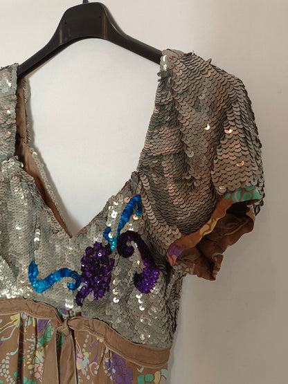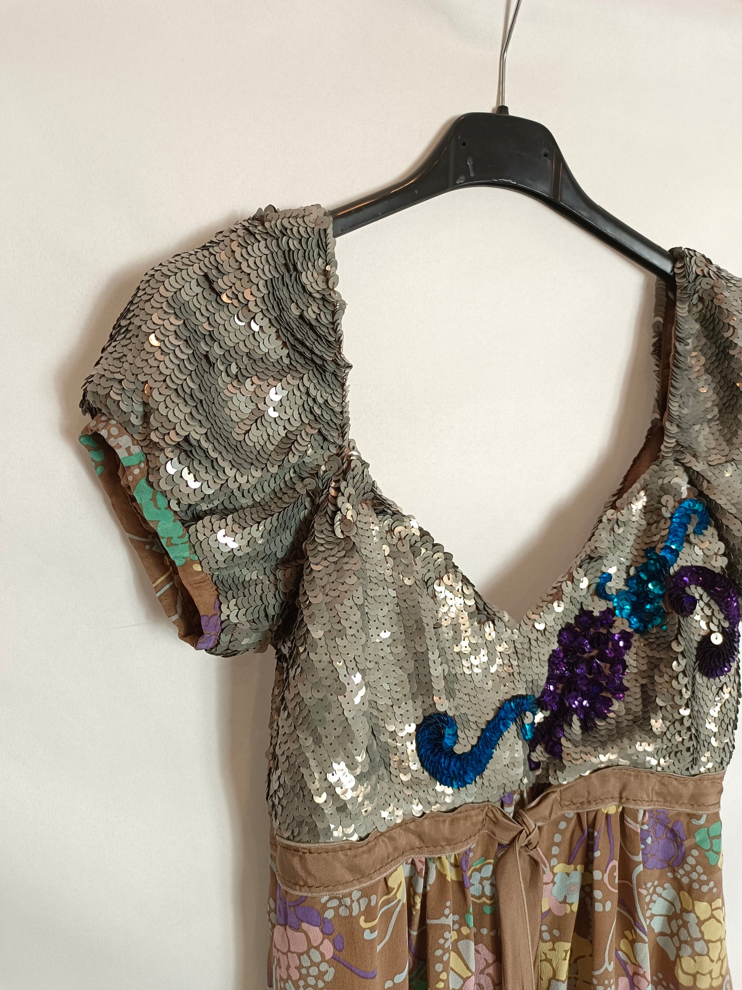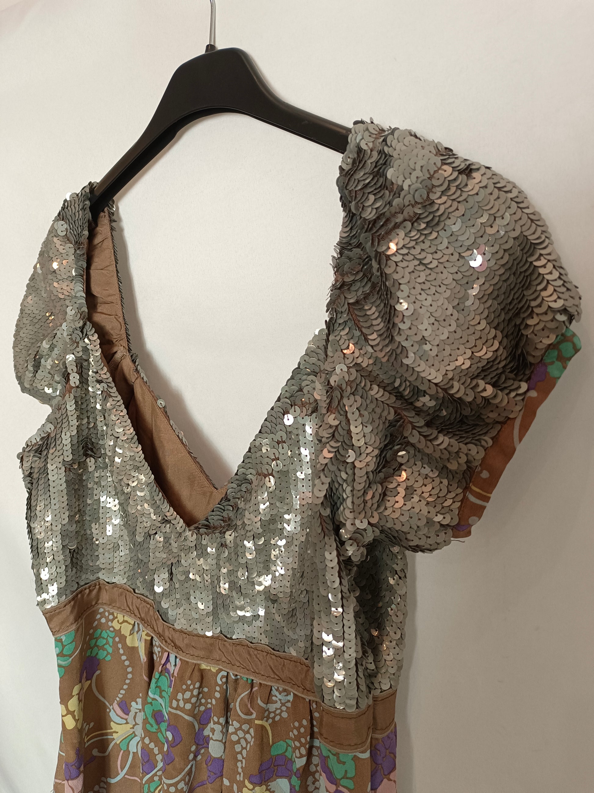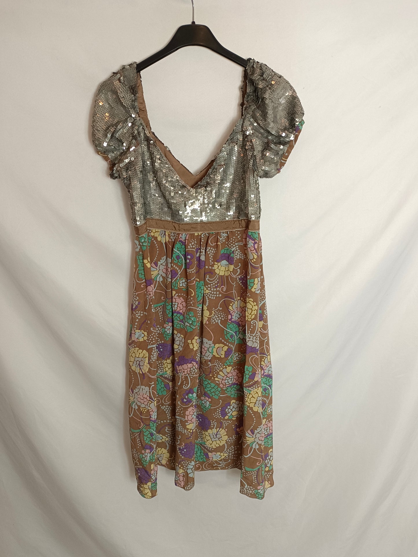 Vestido de flores y lentejuelas cortito, con cremallera latera. No es elástico. De sisa a sisa a sisa 42 cm, largo 98 cm