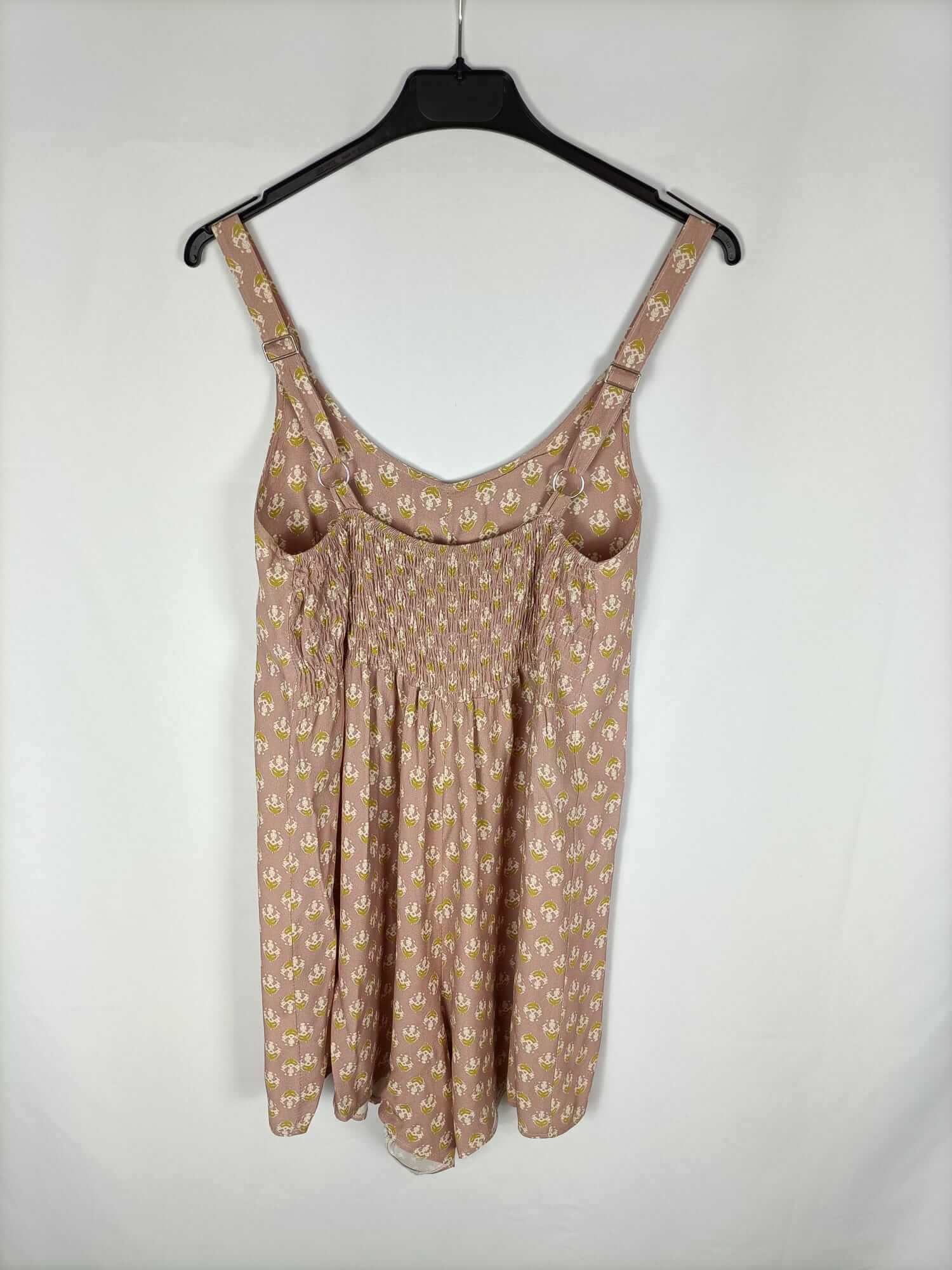 Mono rosa palo fluido con estampado estilo hippie. Tirantes ajustables. Espalda elástica. Largo 82 cm