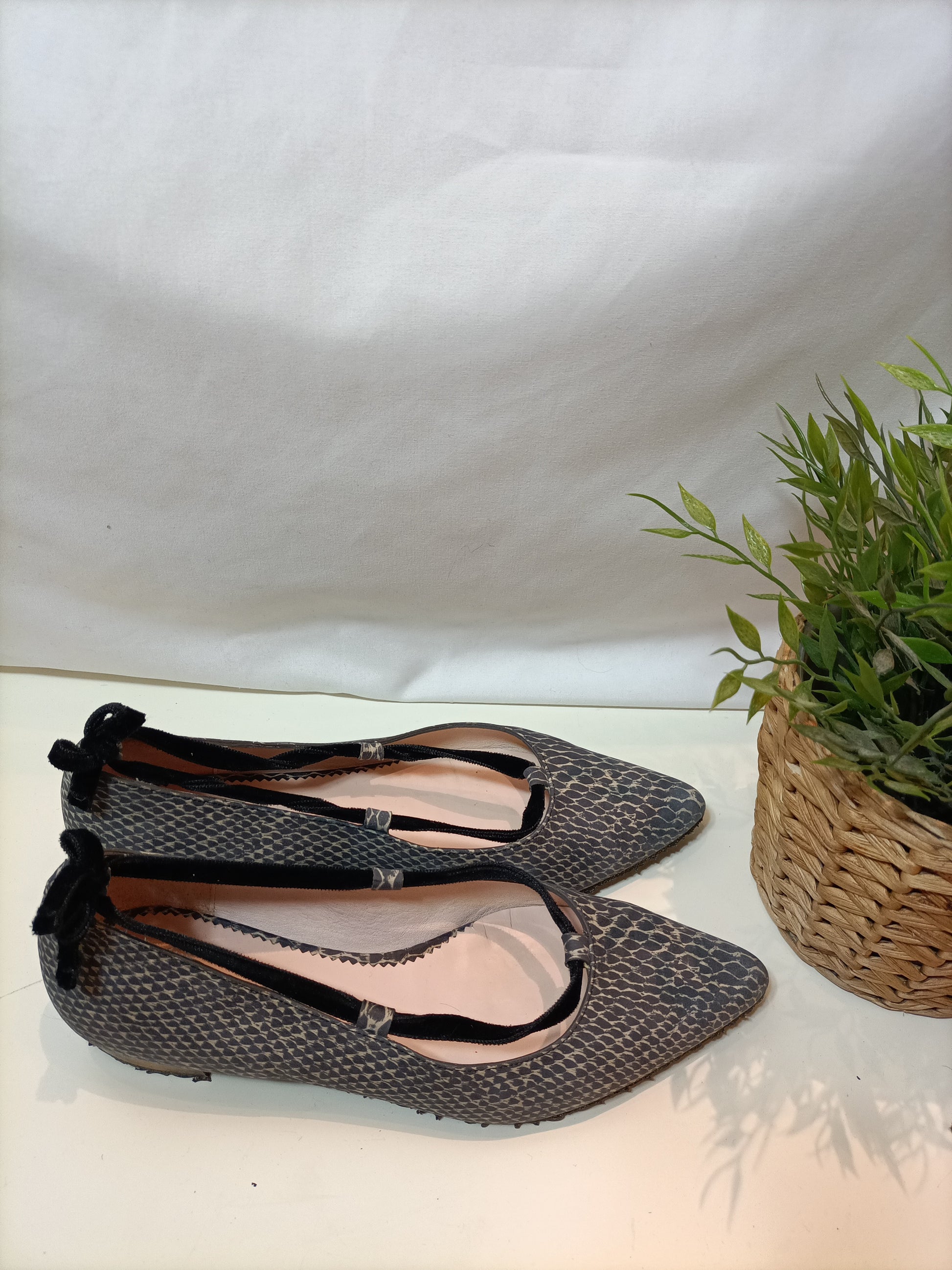 SIN ESTRENAR. Manoletinas grises y beige con detalle de tira de terciopelo.