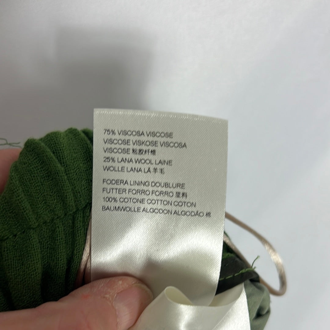 Pantalón verde textura. Lana y viscosa. No elástico. Cibtura 33cm elastico, largo 111cm