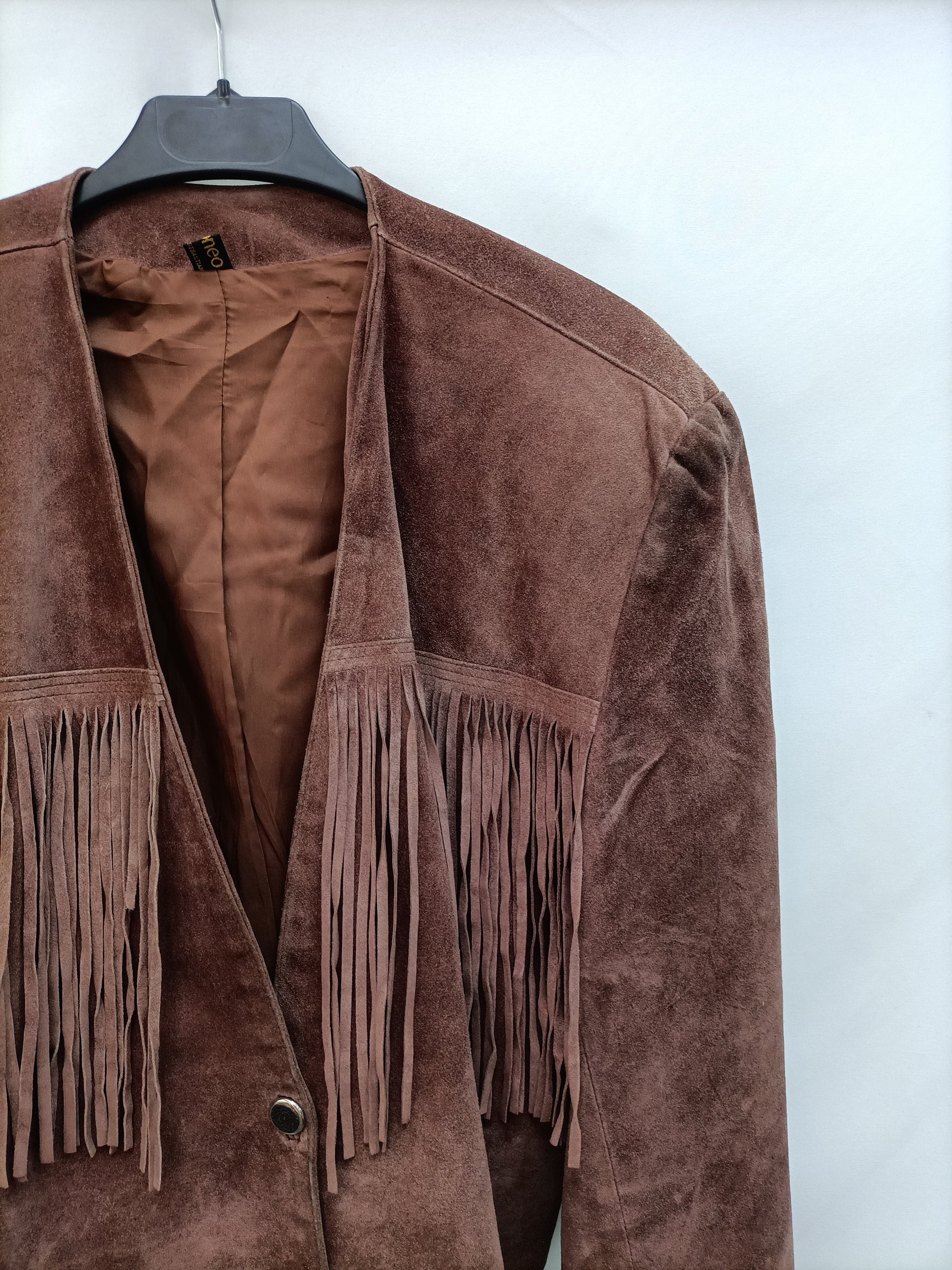 Chaqueta marrón de piel vintage con flecos. No elástica. De sisa a sisa 45 cm largo 49 cm. Tiene típicas marcas de la piel y el tiempo