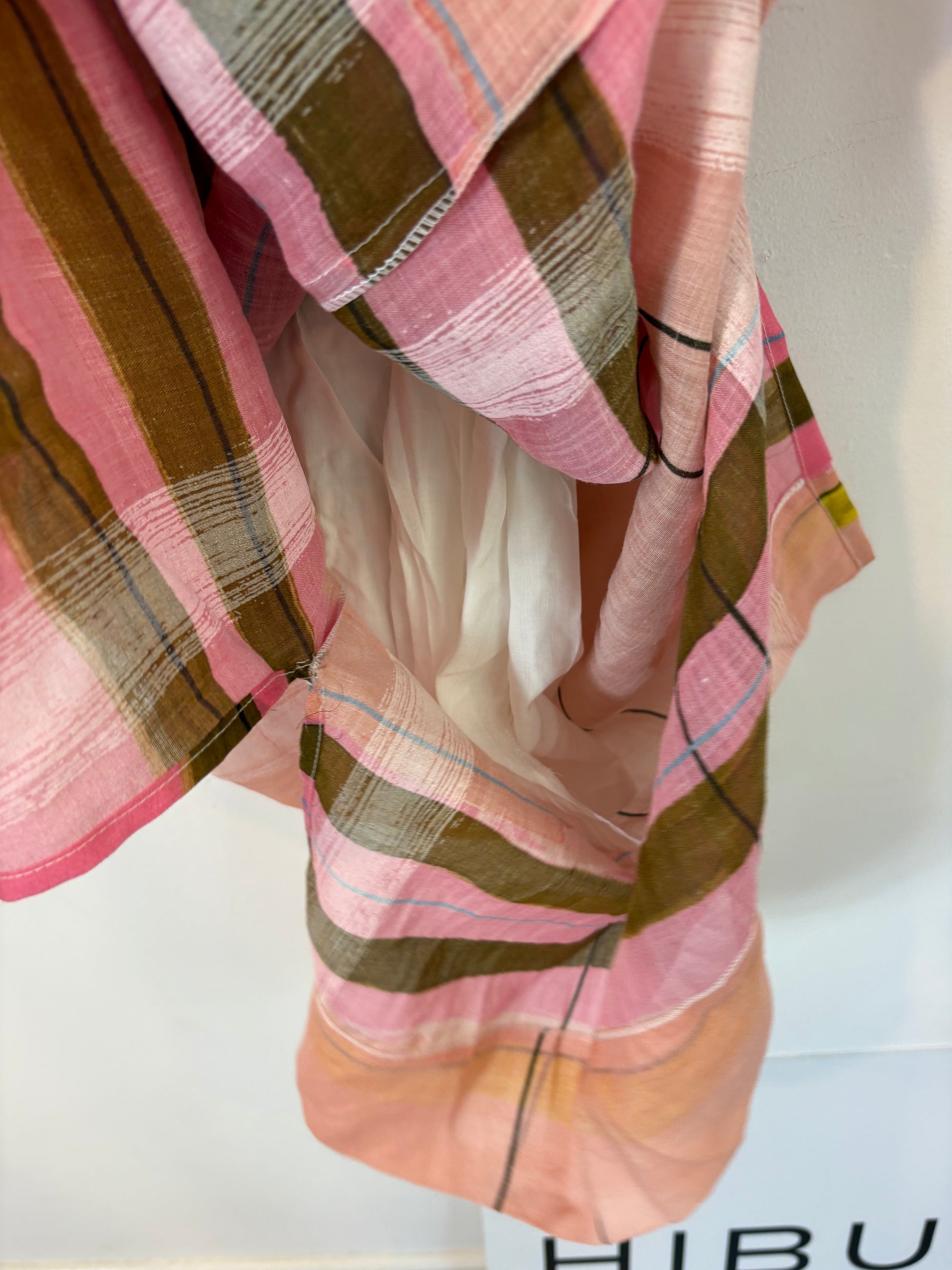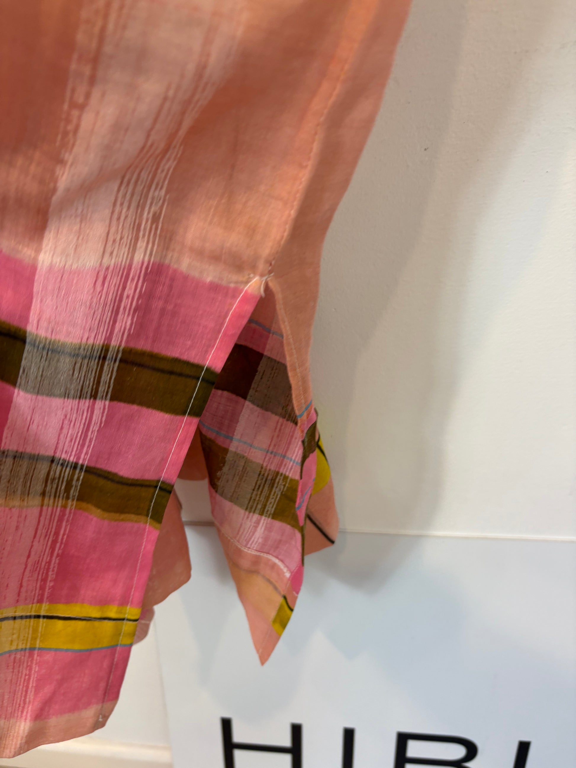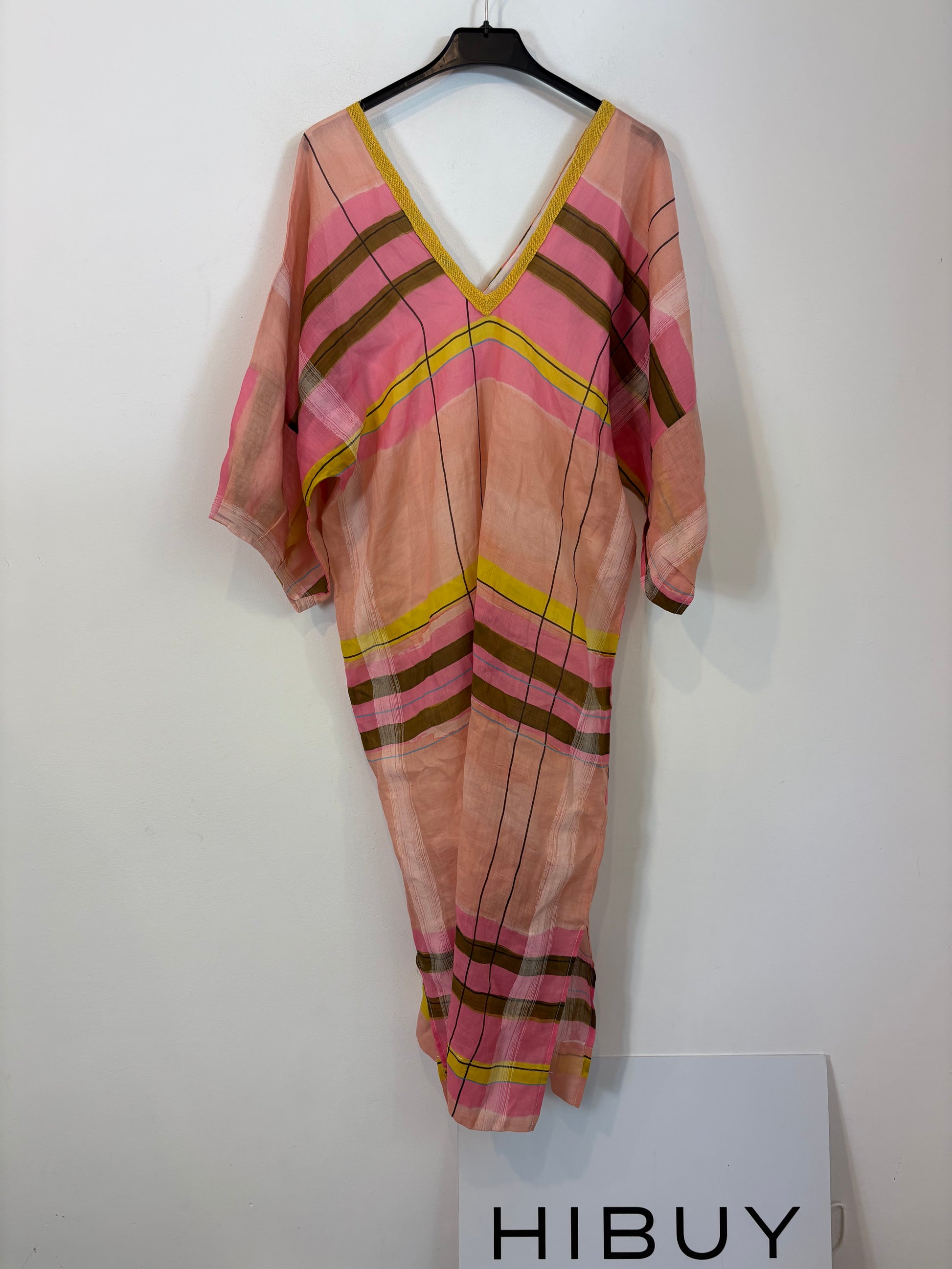 Espalda 54 cm, largo 119 cm. Vestido lino cuadros detalle escote y aberturas laterales. Talla M en etiqueta