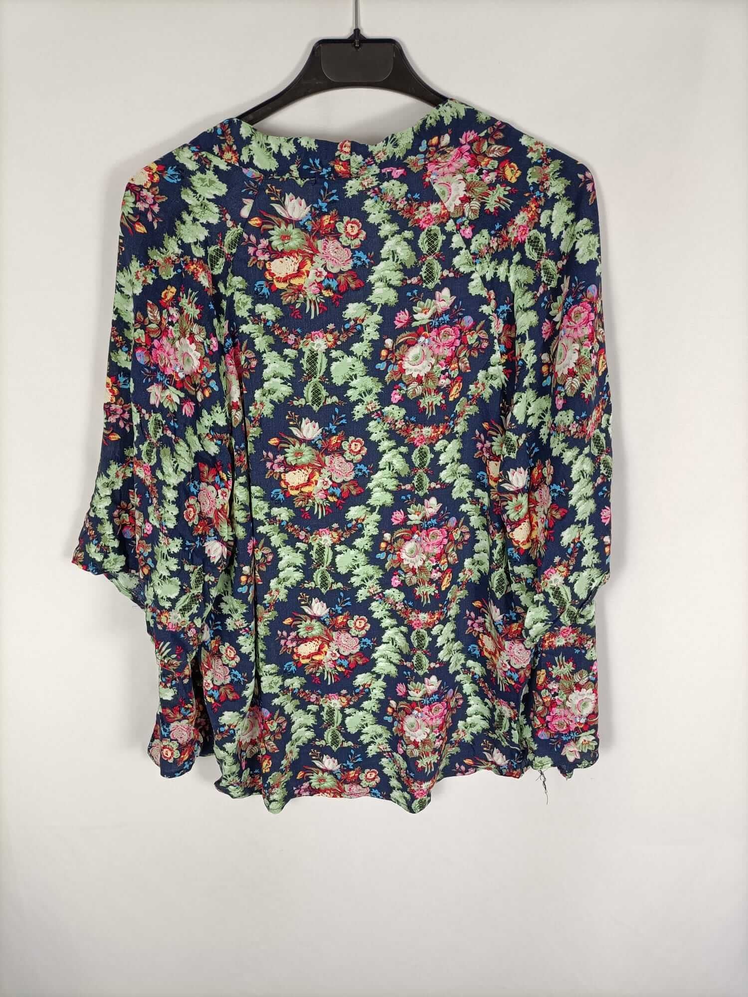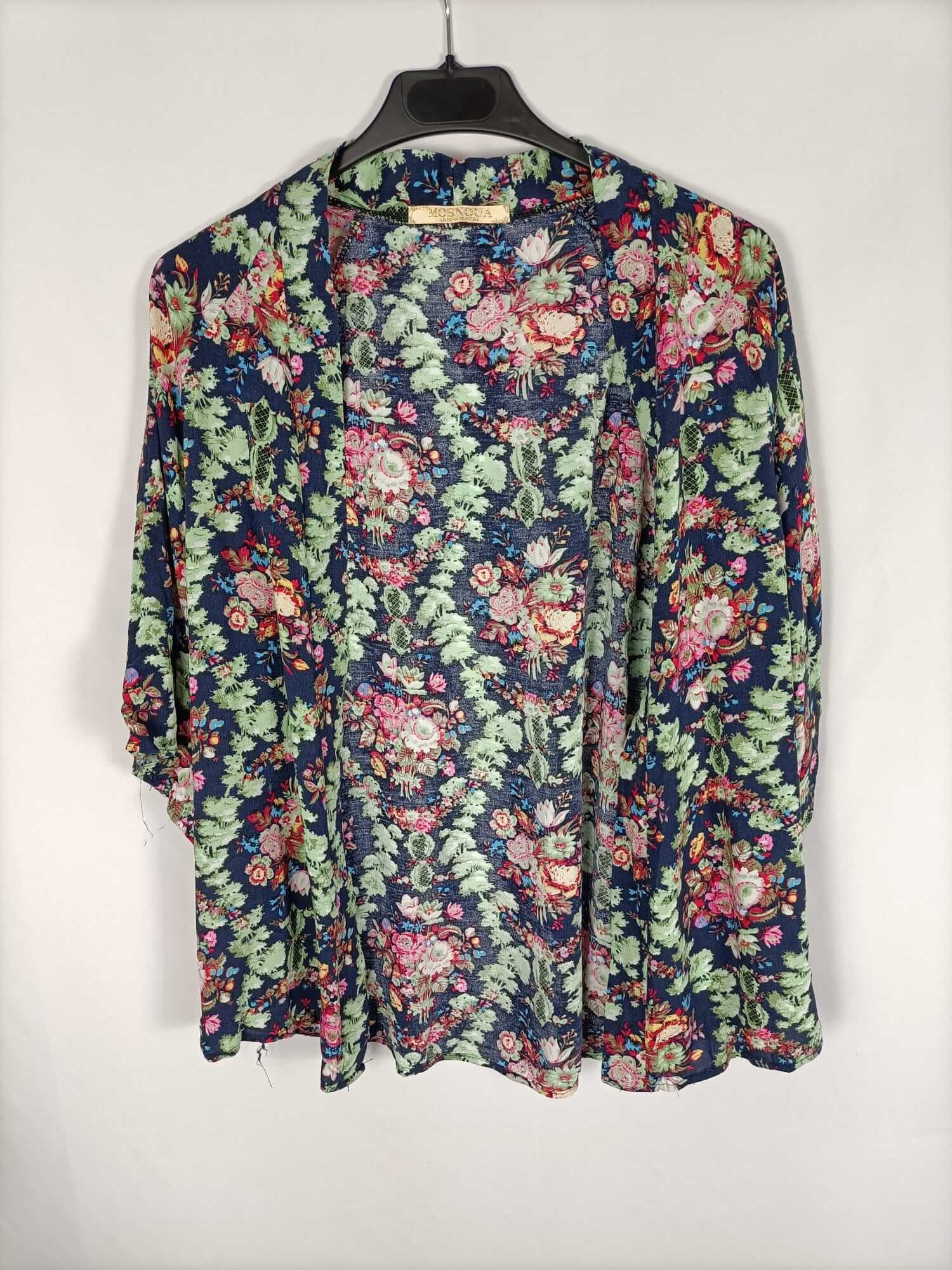 Mosanova. Tu. Kimono azul con flores. Fluido con las mangas estilo murciélago. Largo 69 cm