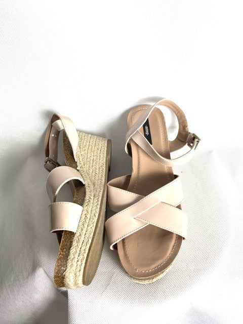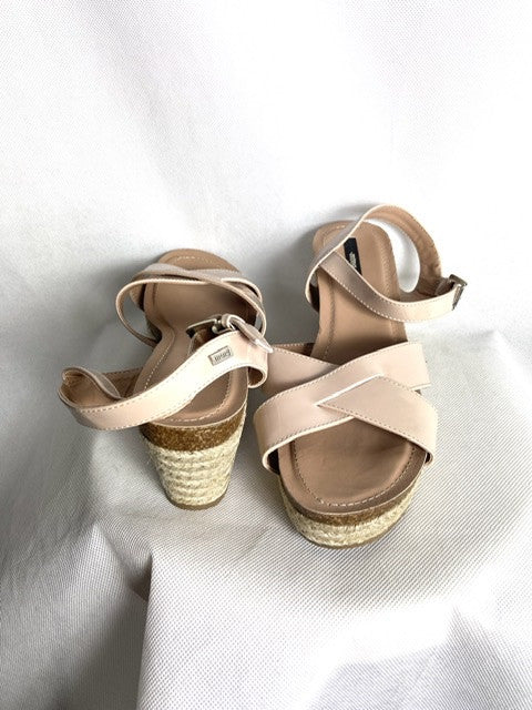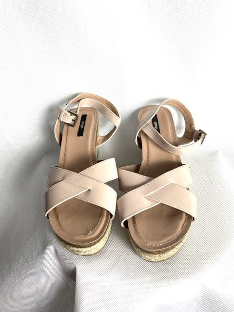 Cuñas rosas cruzadas tipo charol en rosa palo. Tacón mide 8 cm y la plataforma delantera 3 cm.