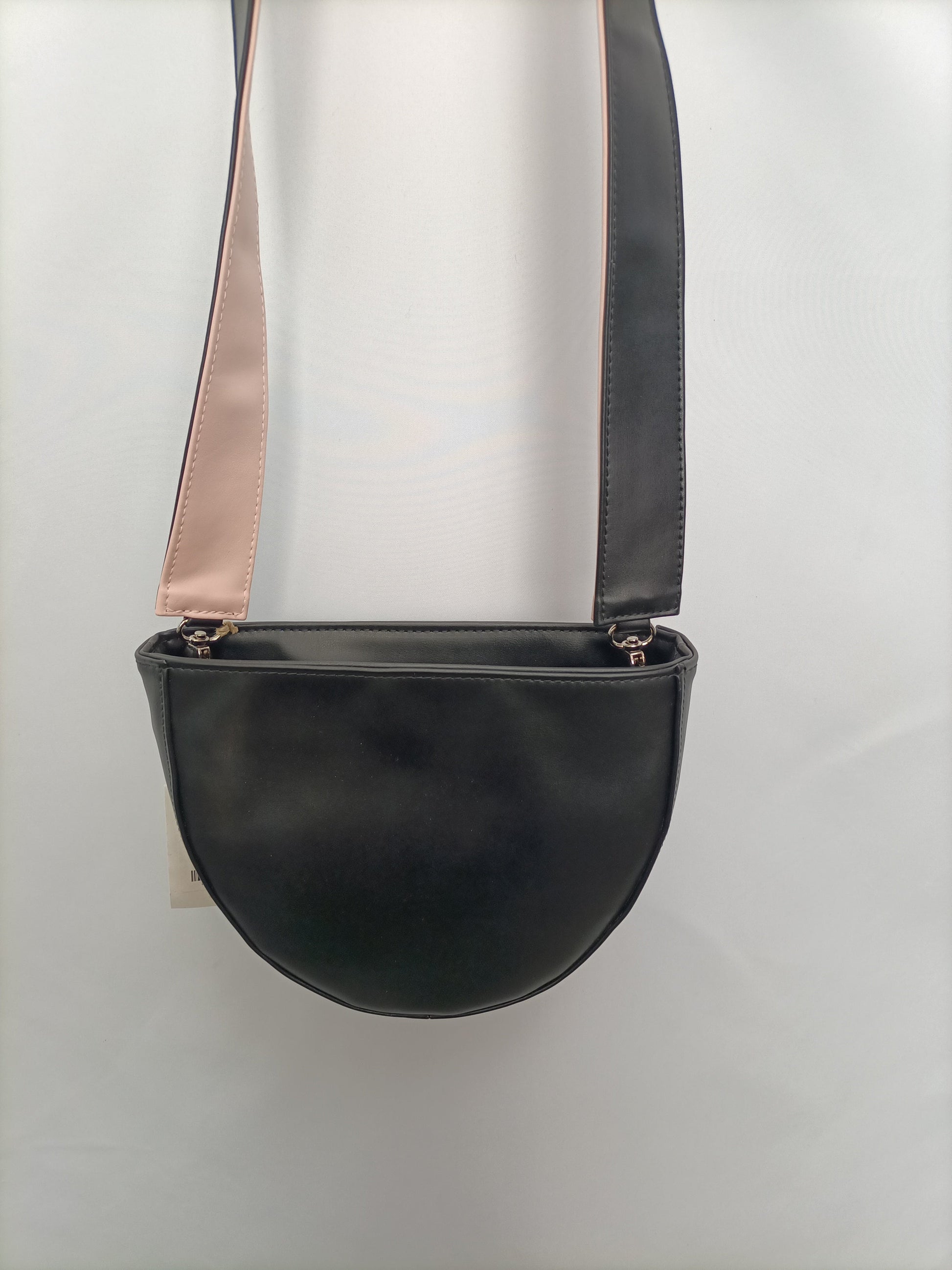 NUEVO CON ETIQUETA. Bolsonegro en forma de semicirculo con el asa reversible rosa y negro. Asa extraíble.