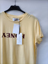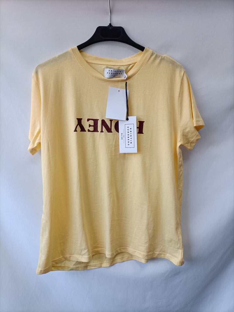 NUEVO CON ETIQUETA. Camiseta básica amarilla con letras. Elástica. Largo 56 cm