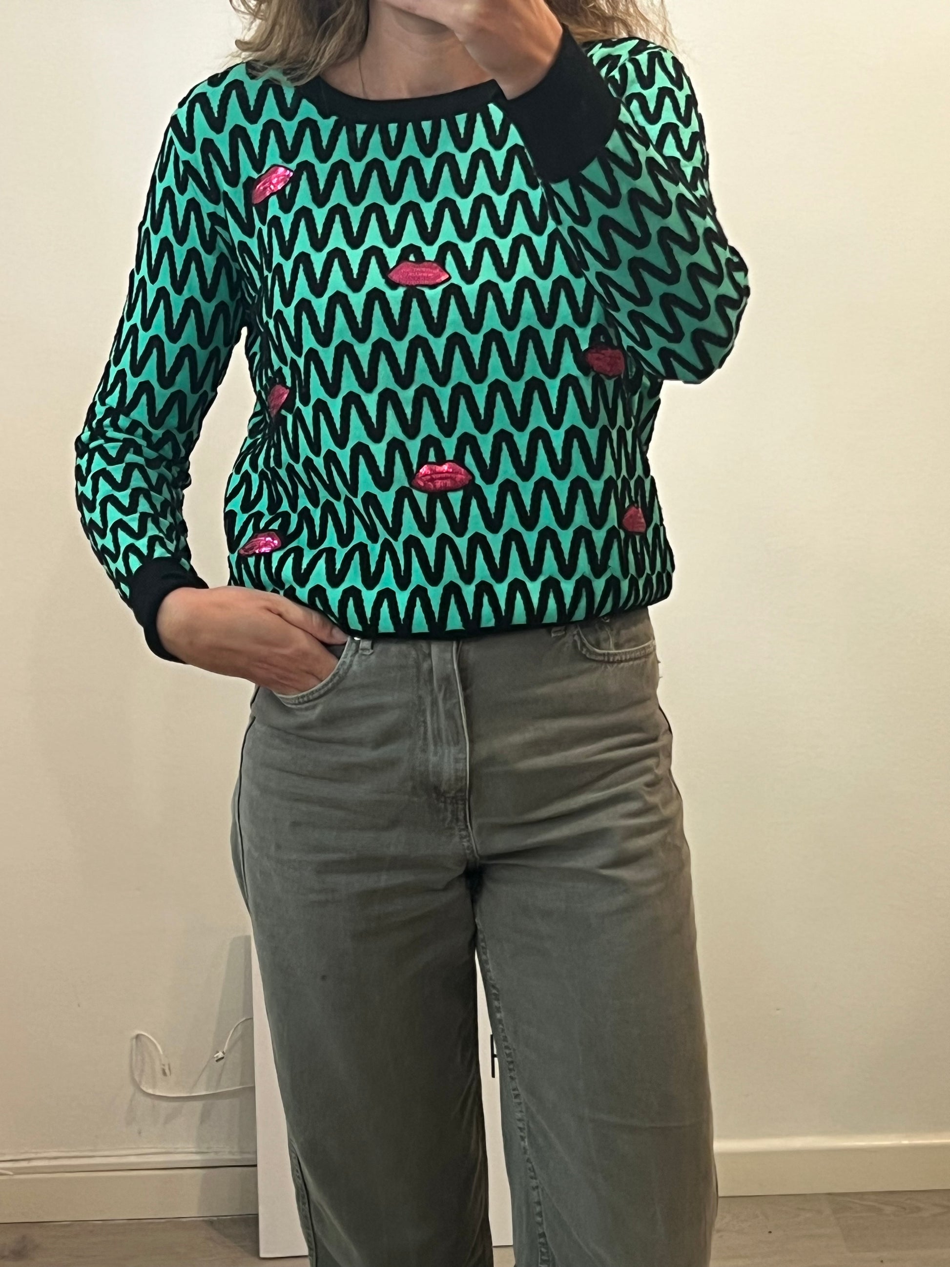 jersey verde fluor con detalles negros y labios de lentejuelas