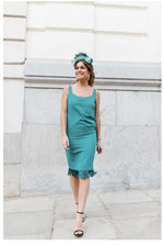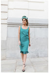 Vestido de crespón aguamarina, con espalda cruzada y con mucha caída. Lleva flecos de color negro de 10cm en el bajo del vestido. Además de tres botones en la parte trasera lateral.