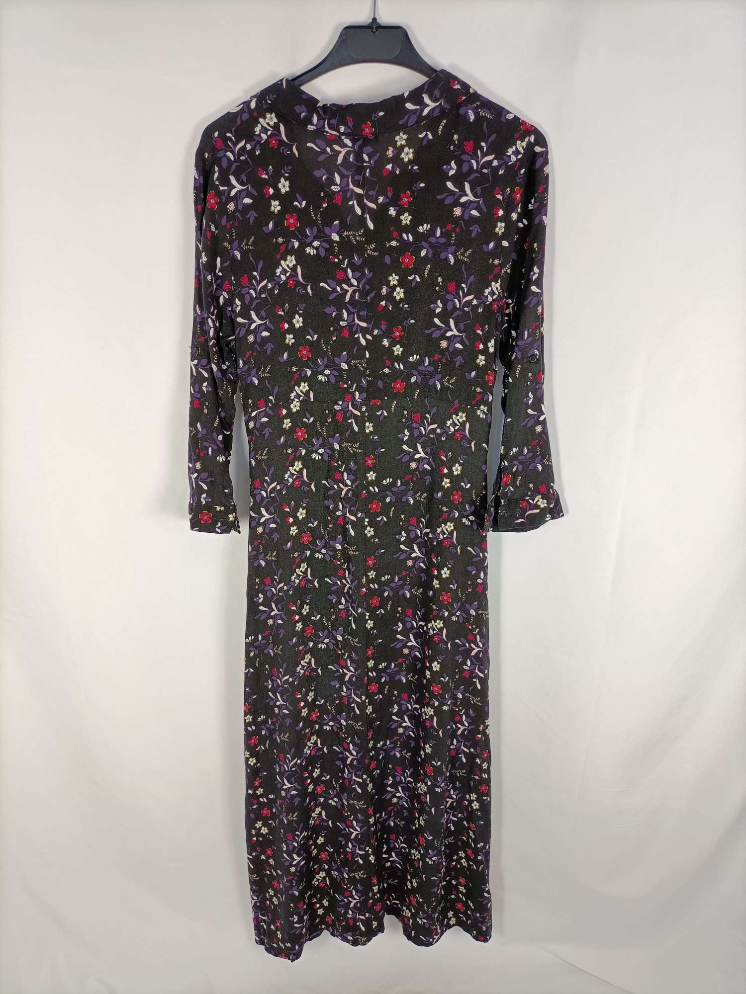 Natura. S. Vestido negro largo estilo camisero con florecitas. Abotonado. No elástico. De sisa a sisa 41 cm largo 130 cm