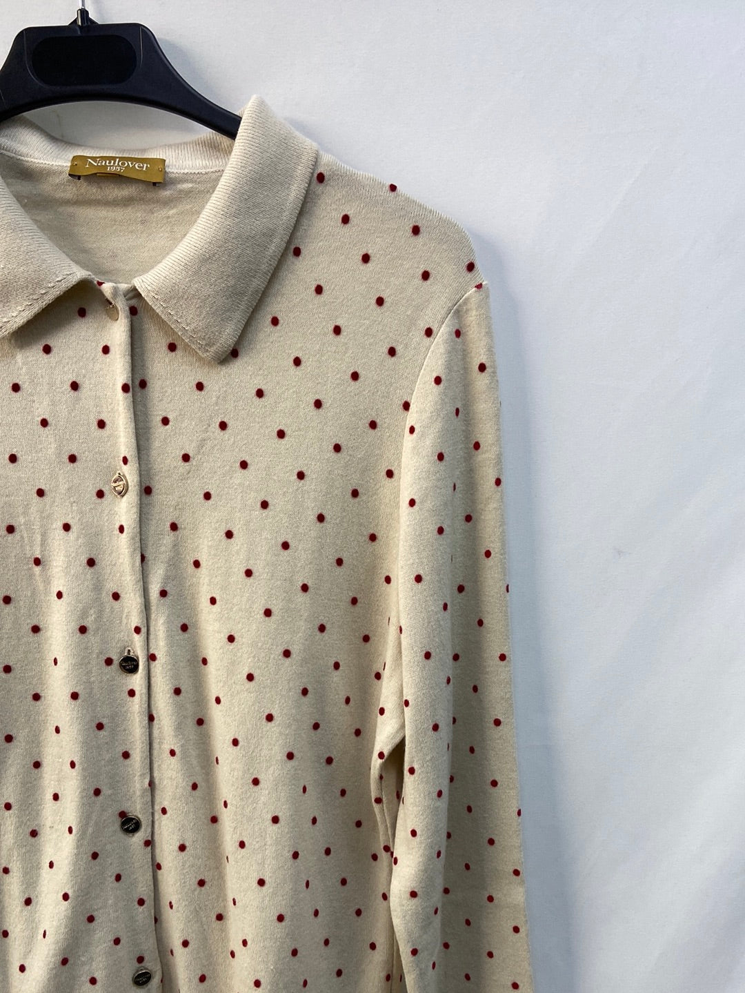 Chaqueta muy elástica, tipo rebeca polera con botones estampado lunares .