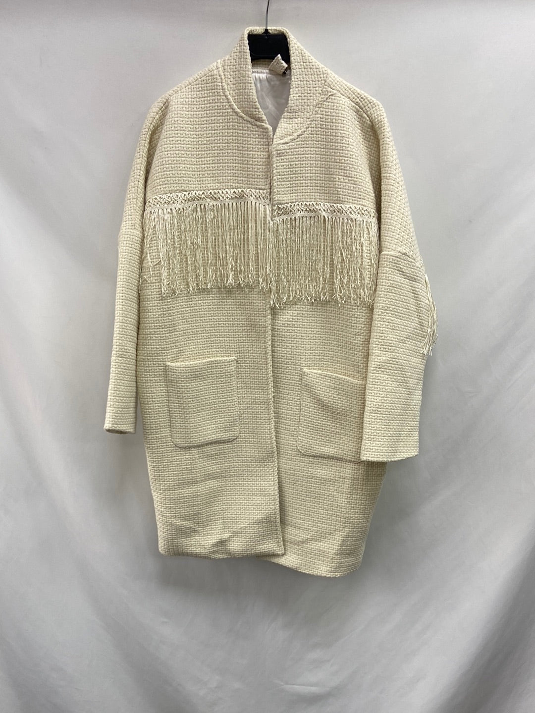 Abrigo largo tejido trenzado detalle de flecos, se abrocha con enganches. Largo 88 cm