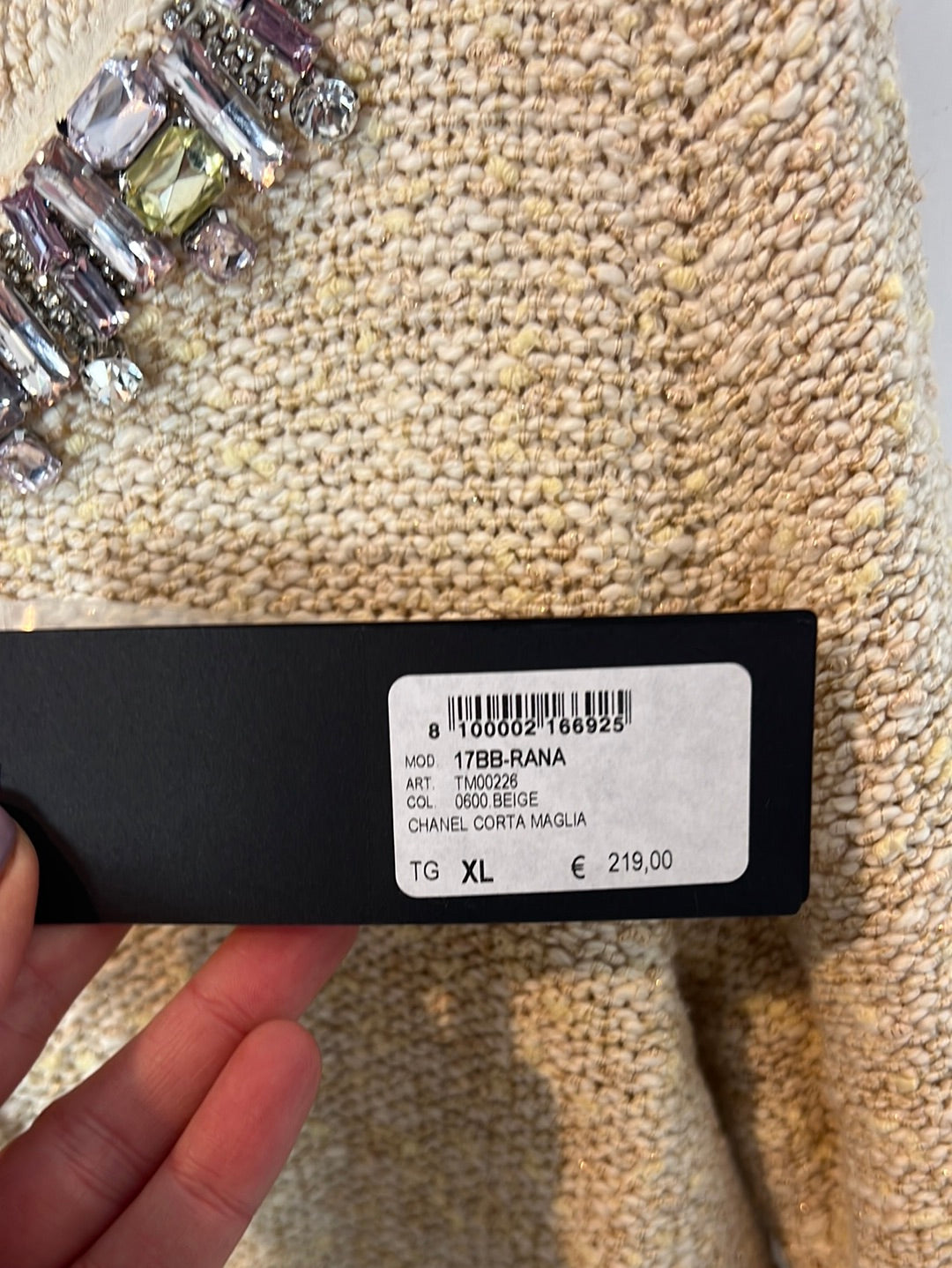 NUEVO CON ETIQUETA. Chaqueta beige de punto elástico de tejido tweed con detalle de abalorios en el cuello . Hílenos 40cm, de sisa a sisa 45ck, largo 47cm