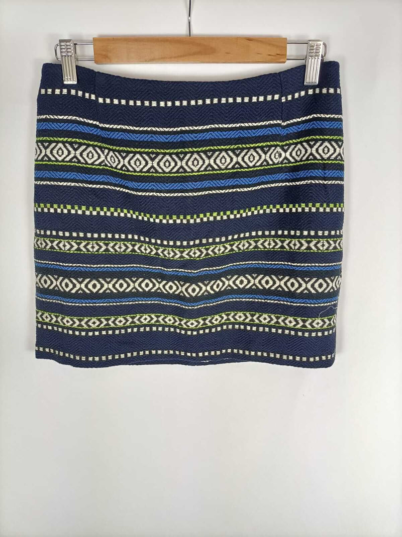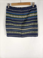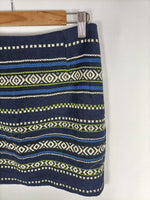 Never mind. 38. Falda azul cortita de tejido con textura y estampado étnico. No elástico. Cintura 36 cm largo 40 cm