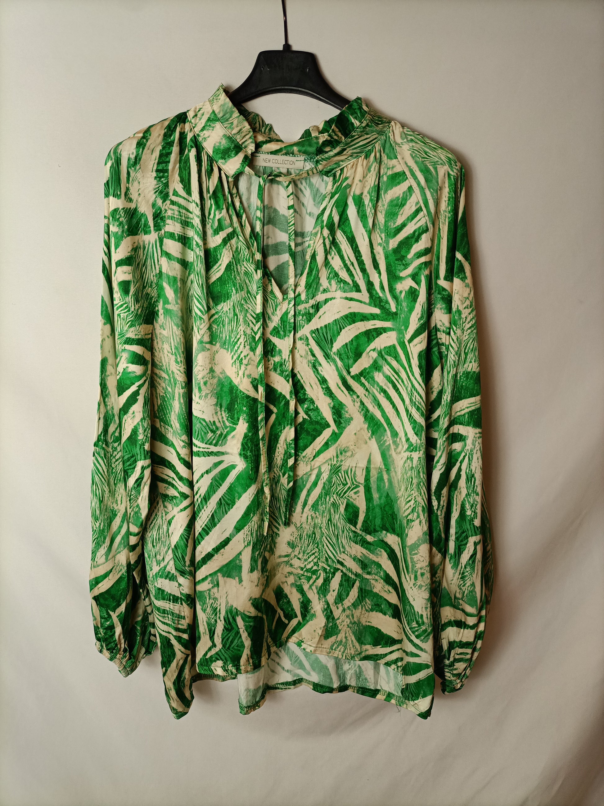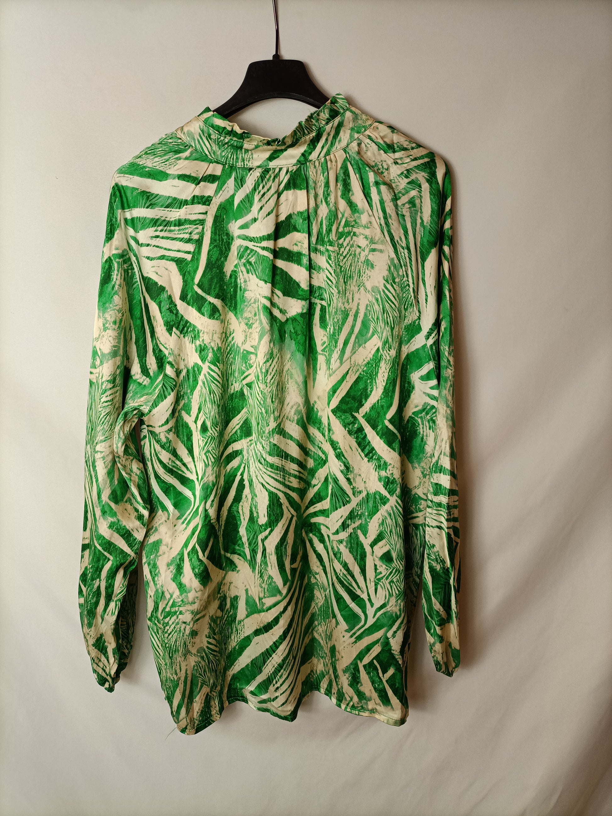 blusa fluida con estampado de hojas en verde y beige. largo 70 cm