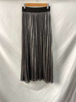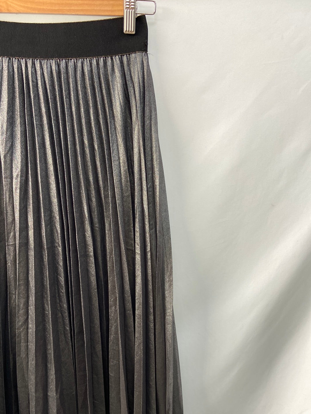 New collection. Talla única. Falda midi tablas plateado oscuro. Cintura elástica que puede ir desde una talla 34 a una talla 38y largo 93cm. Forro interior. 100% poliéster