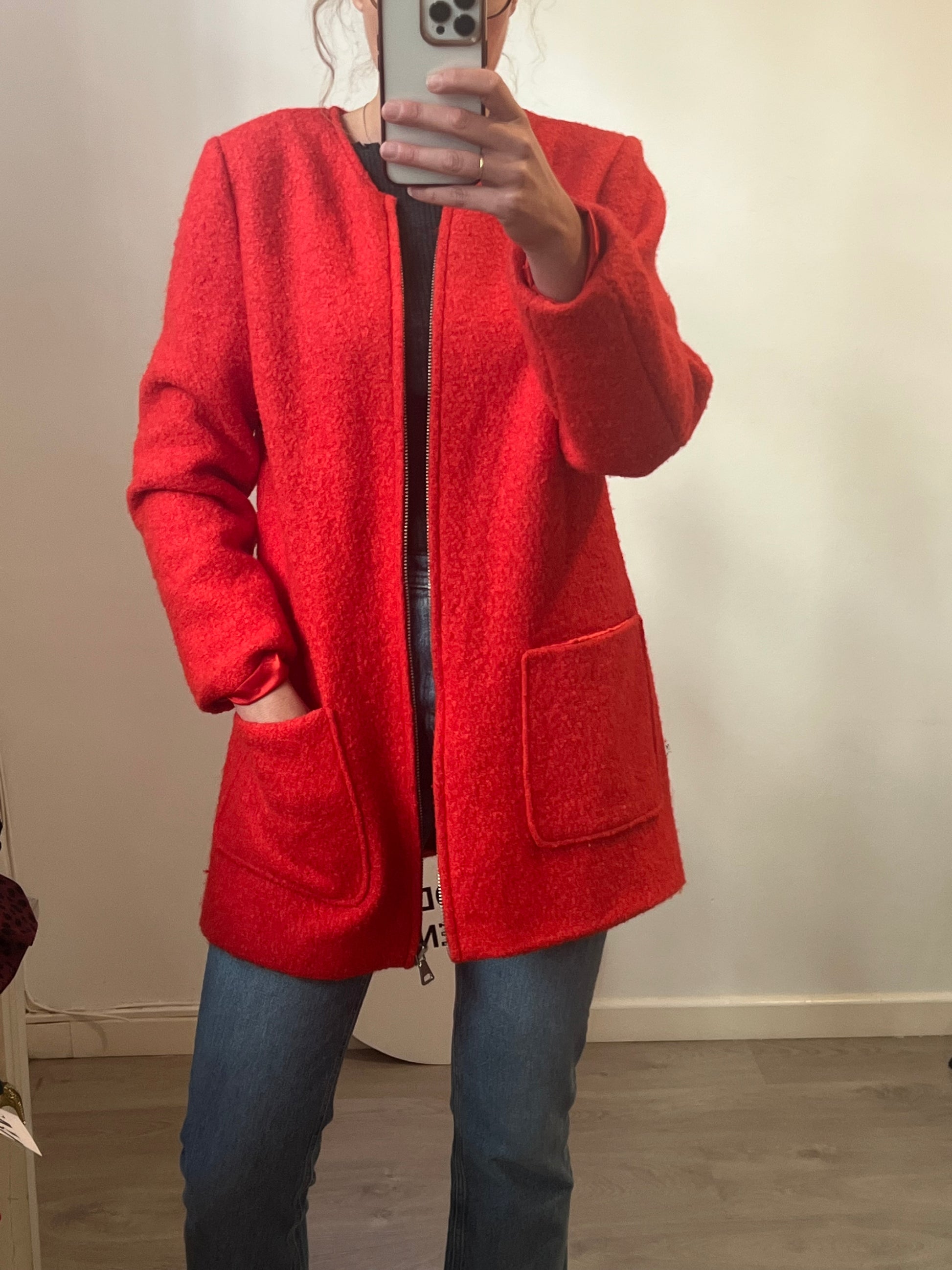 abrigo rojo de tejido de rizo con cremallera. de sisa a sisa 50 cm largo 56 cm