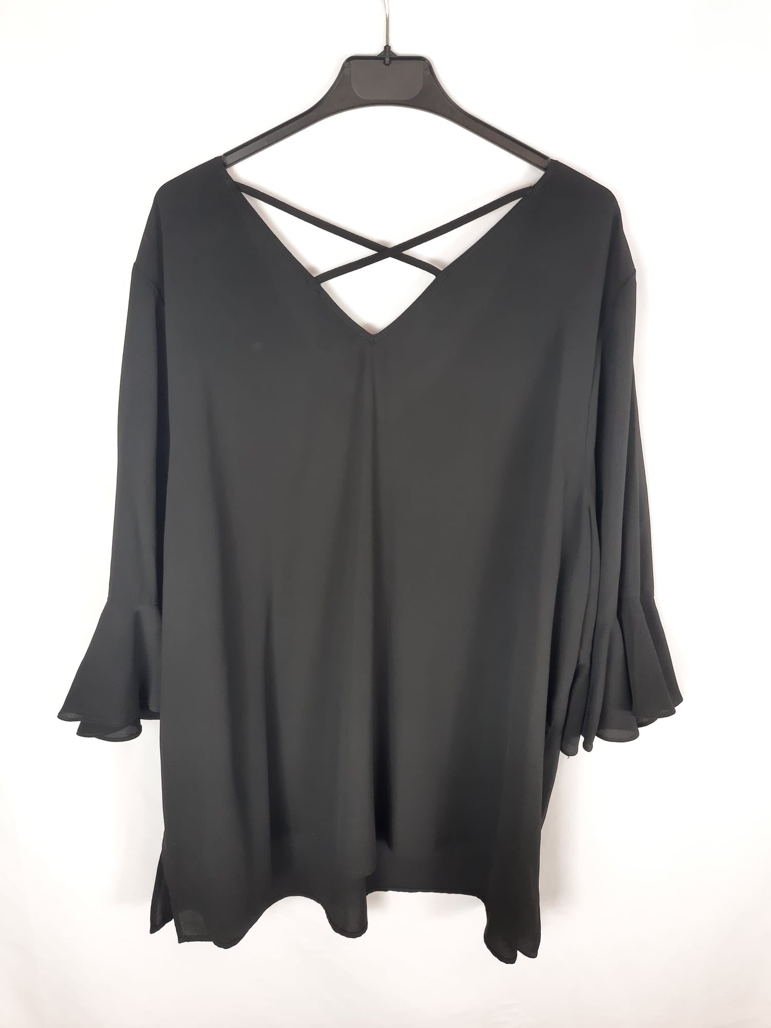 New look. Blusa negra fluisa con las mangas 3/4 con volante y espalda un poco abierta con cuerda. No elástica. De sisa a sisa 70 cm largo 76 cm