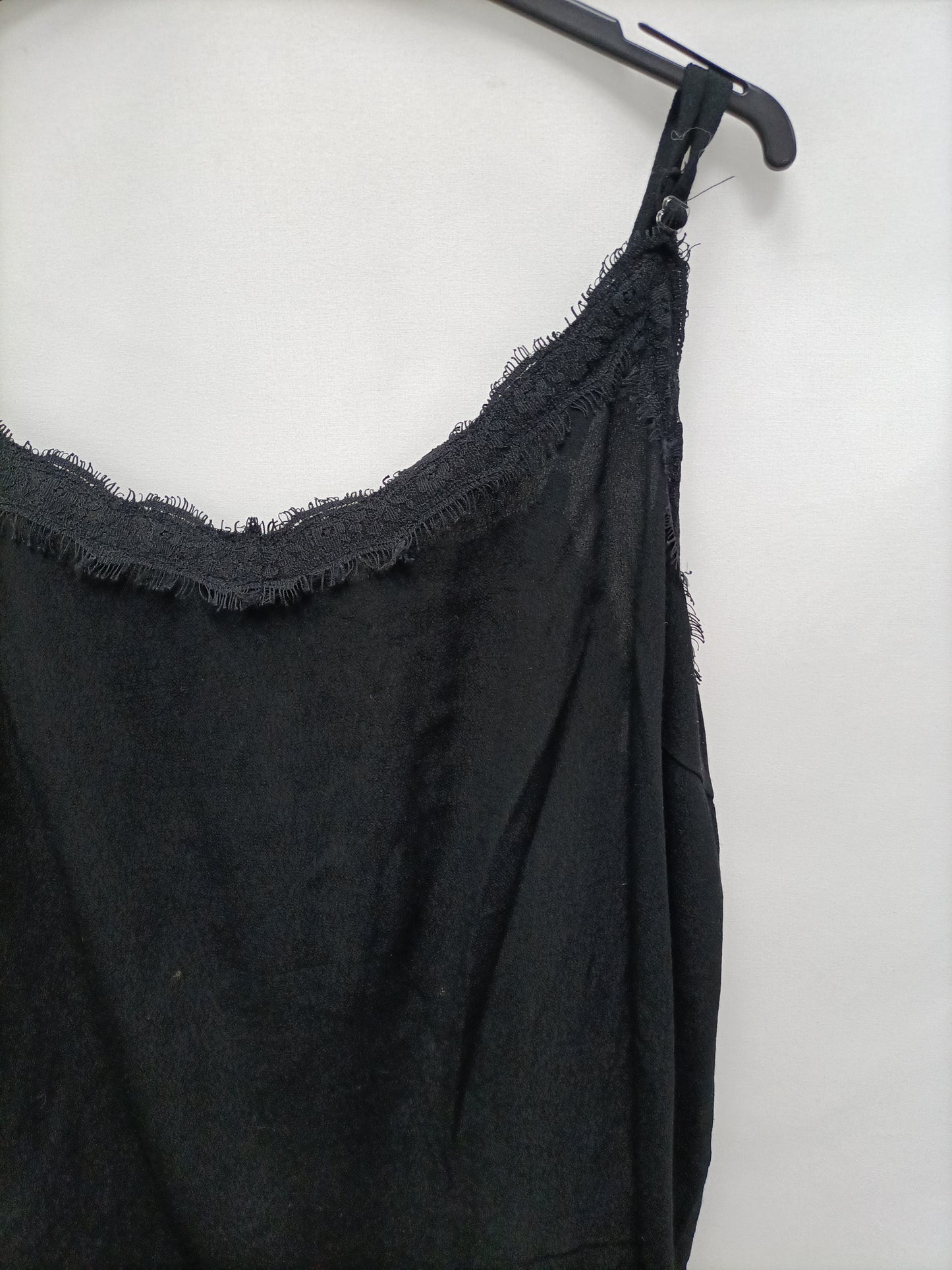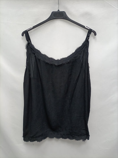 Top lencero negro con encaje en la parte de arriba y abajo, tiene tirantes ajustables. De sisa a sisa 63 cm , largo 62 cm