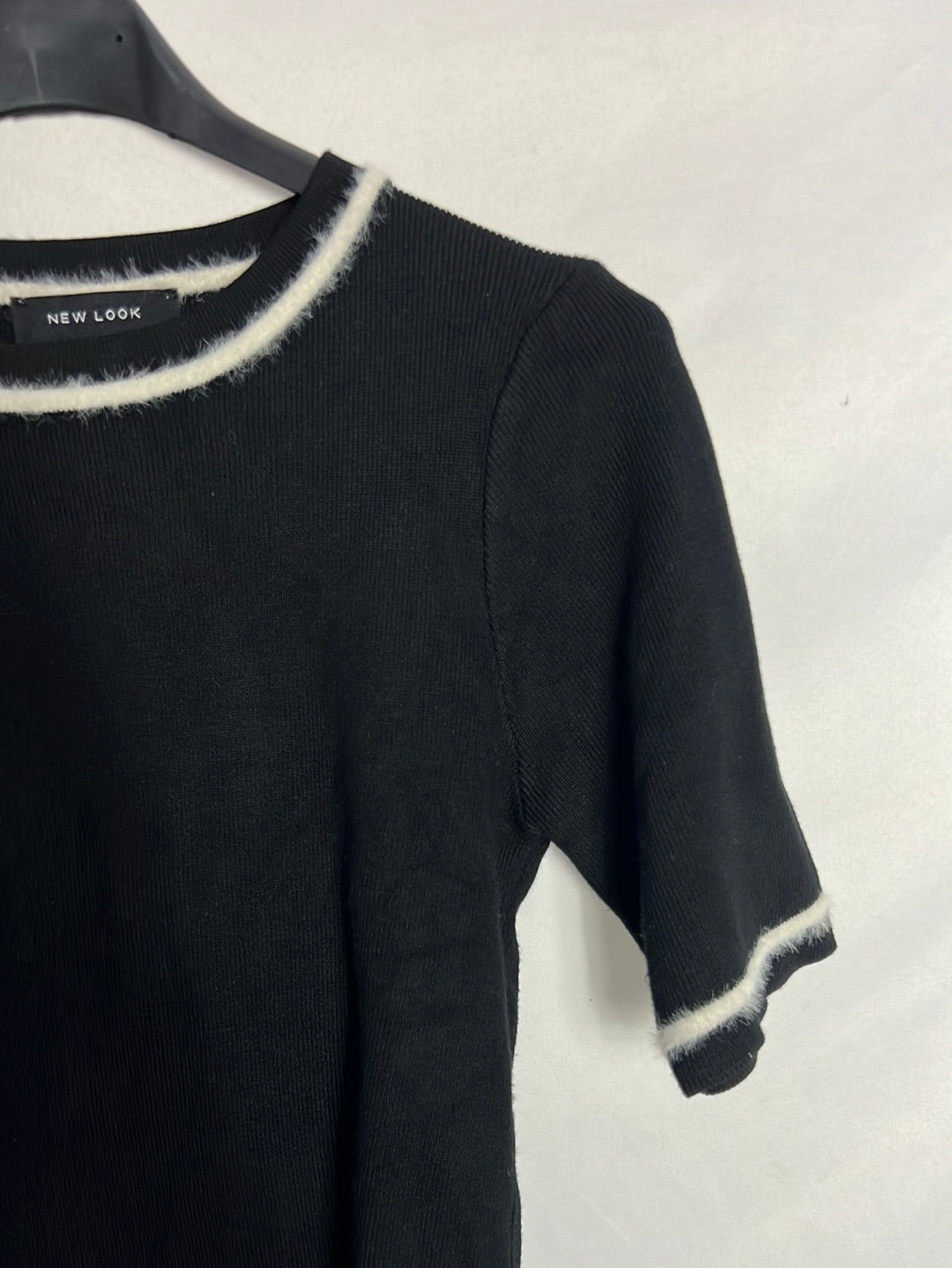 Top punto negro elástico con detalle en cuello y mangas en blanco