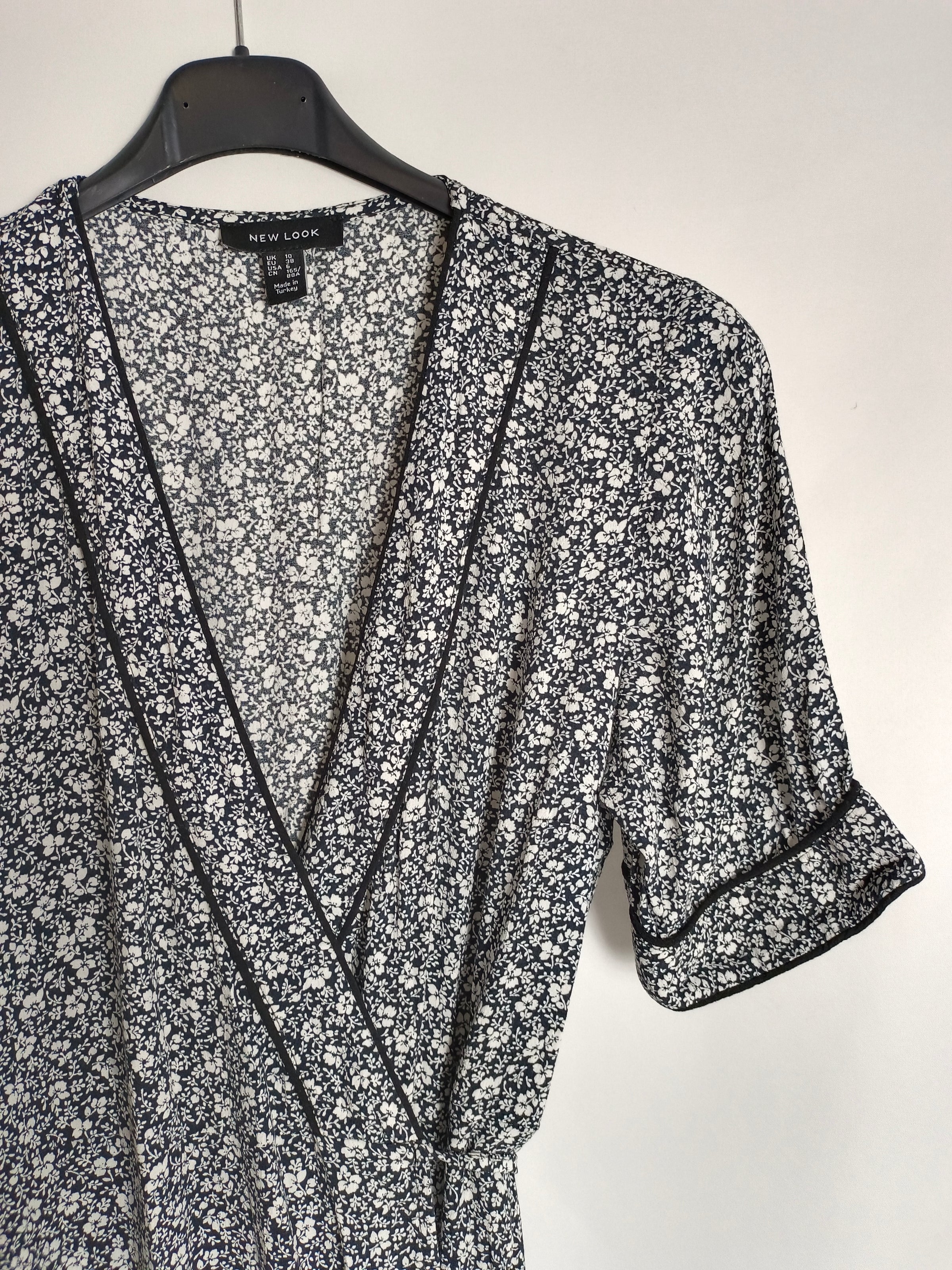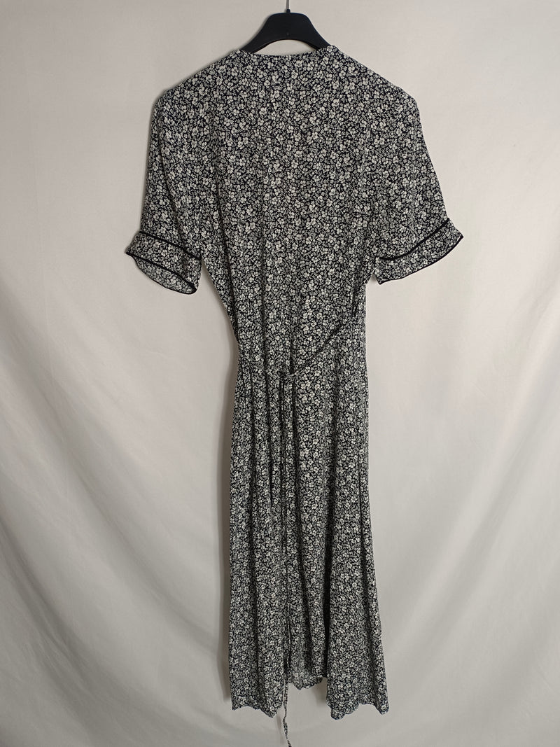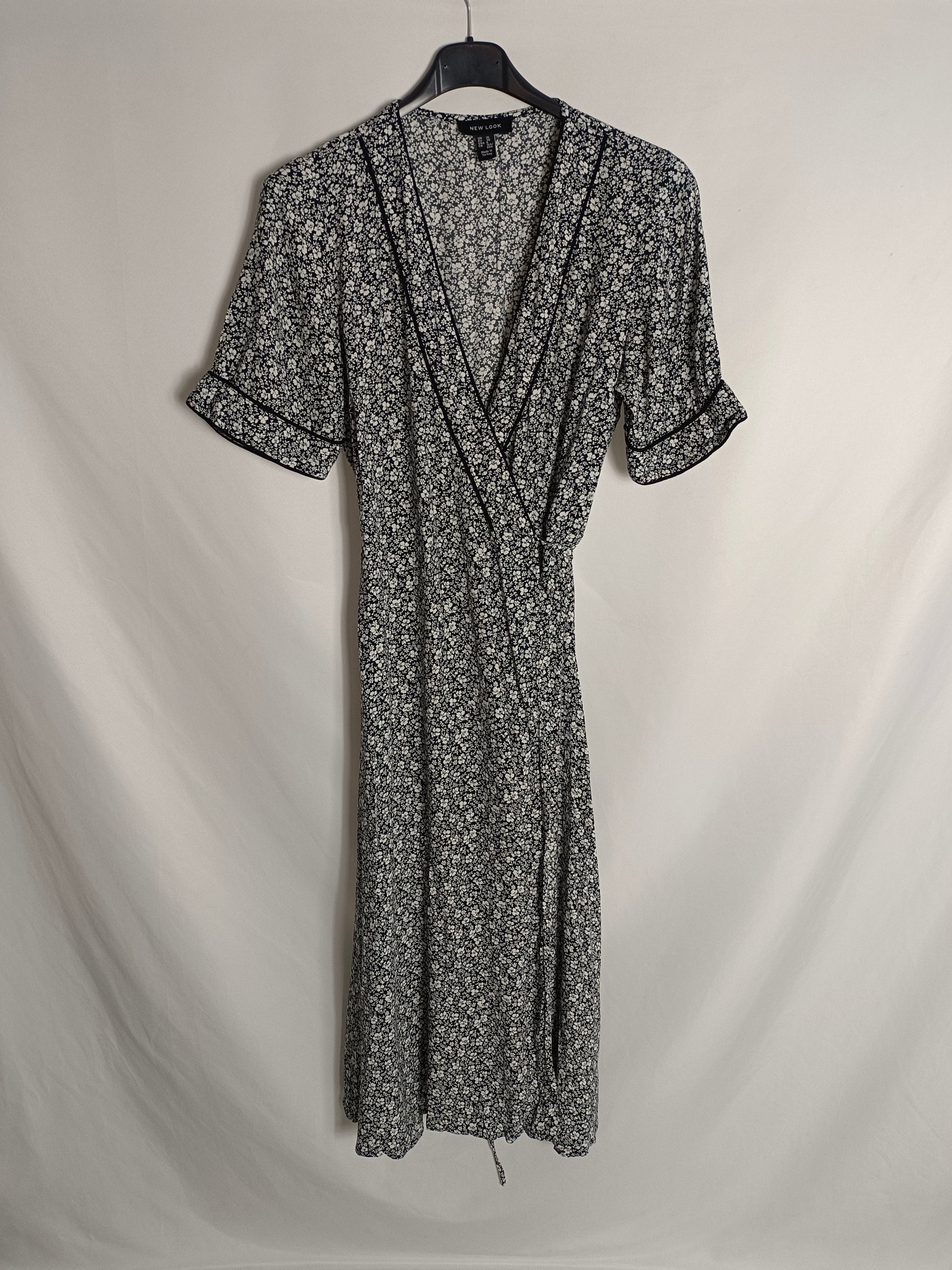 vestido midi negro con flores blancas. Cruzado, no elástico.