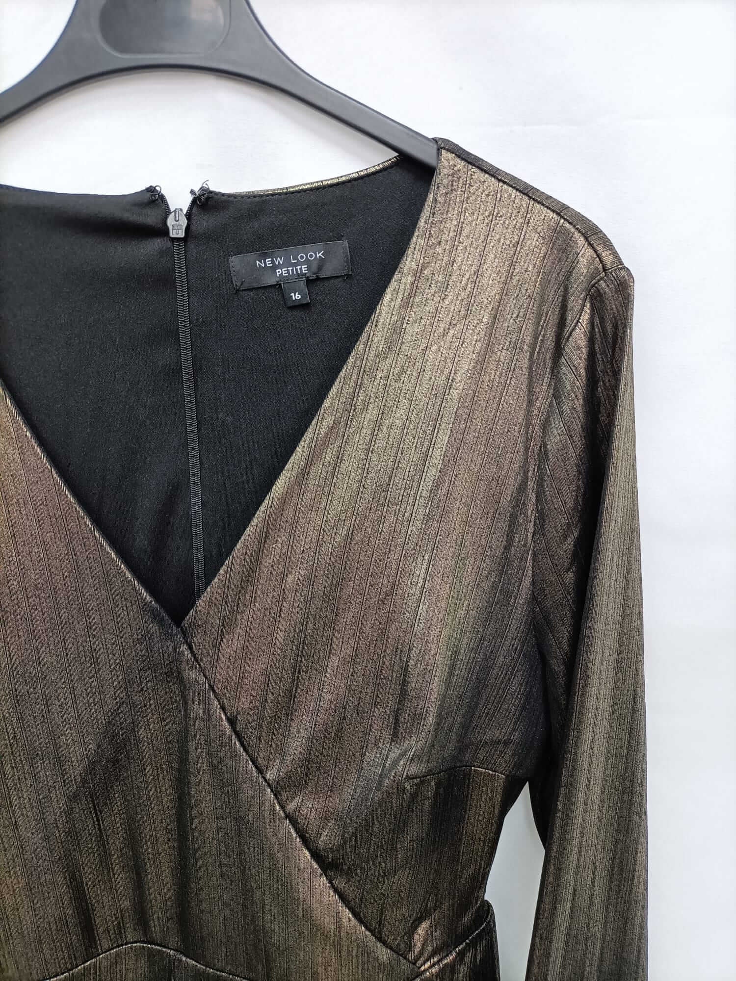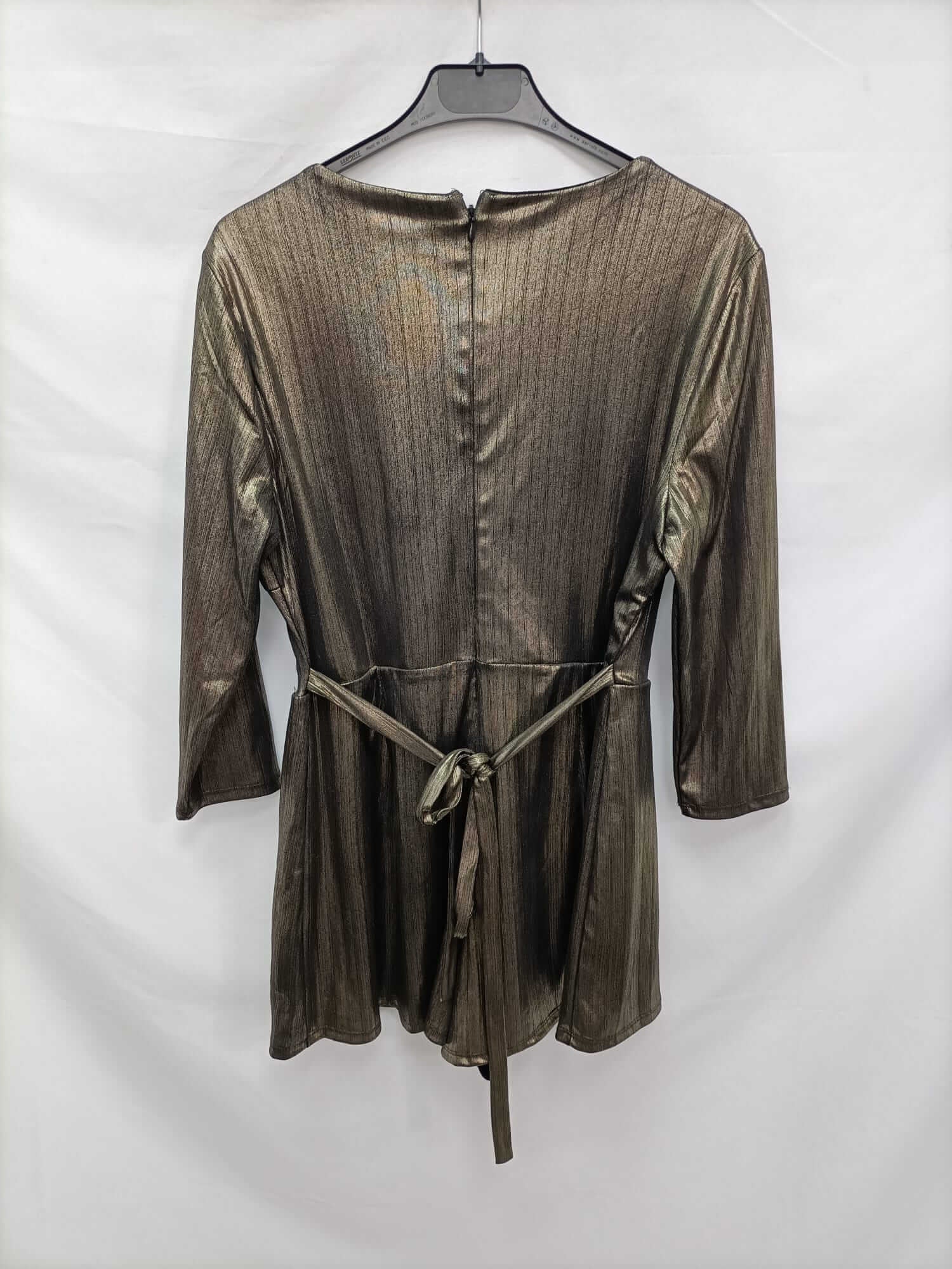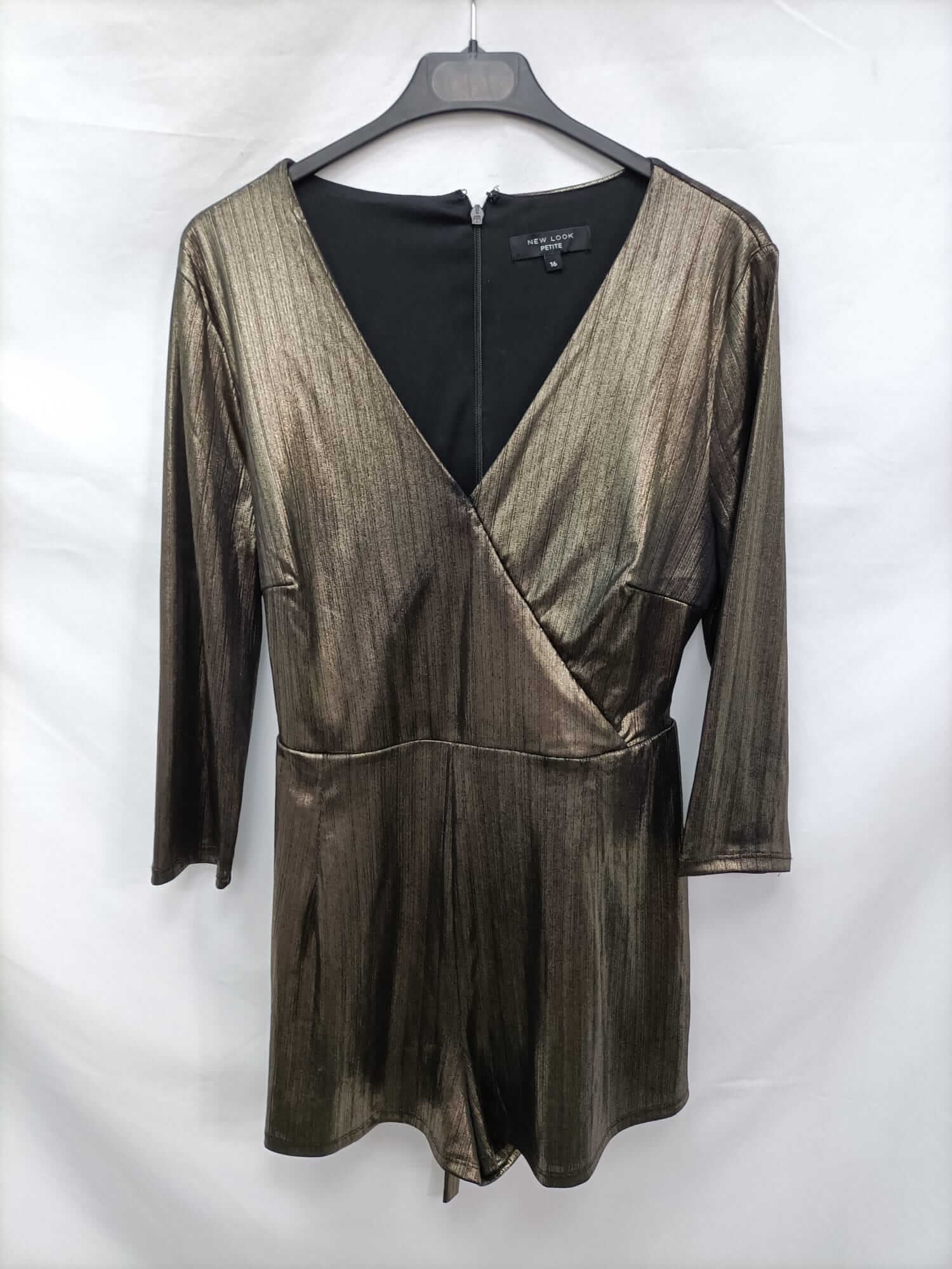 New look petite. T. 44. Mono fluido corto color bronce con escote en pico y detalle de lazada. Elastico. De sisa a sisa 49 cm largo 77 cm