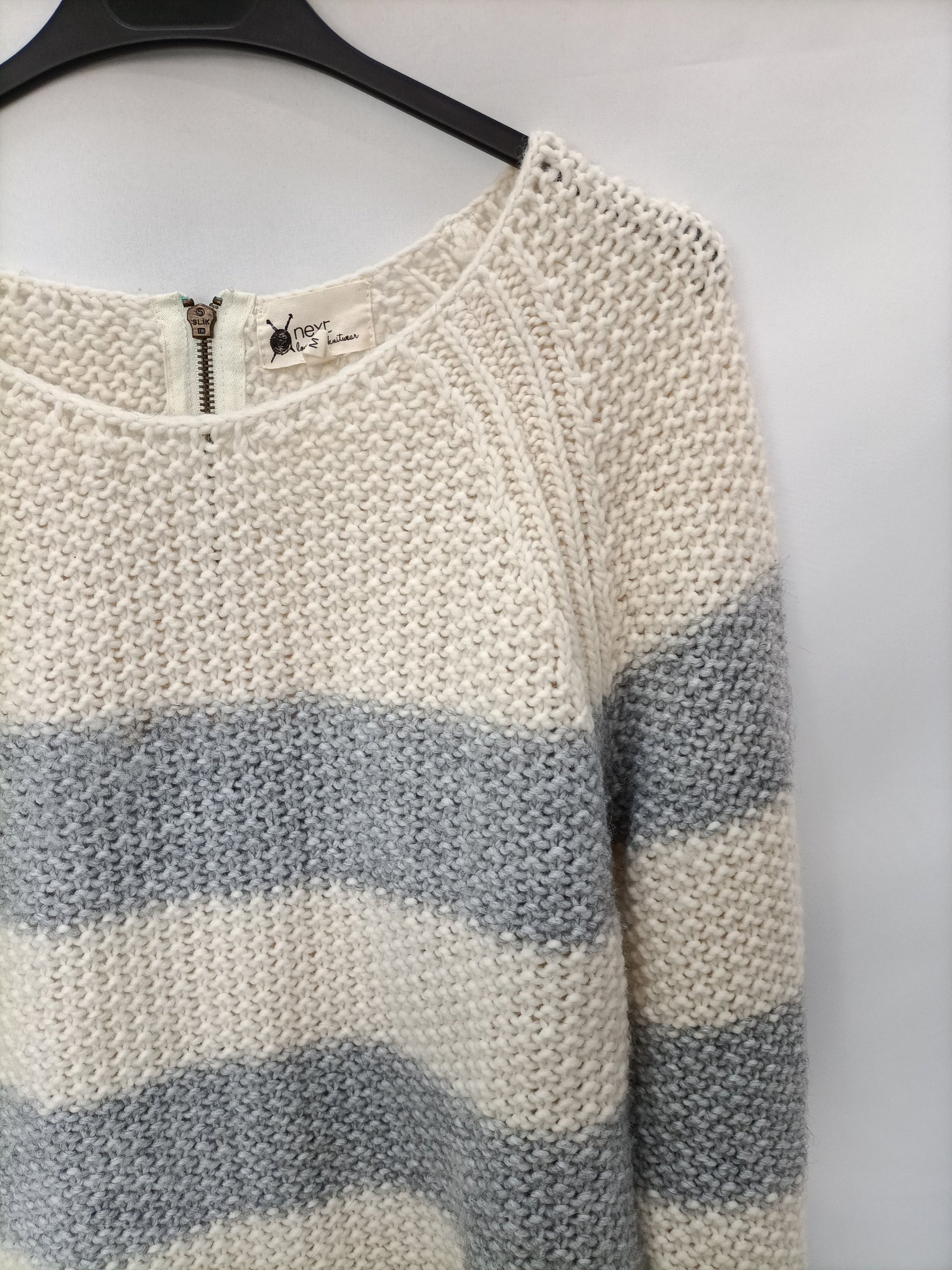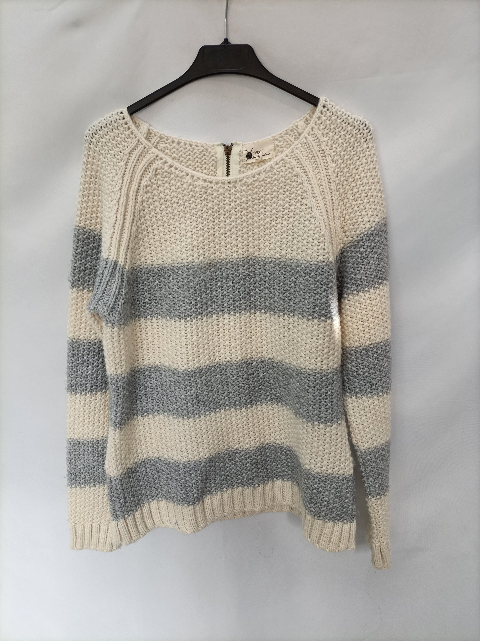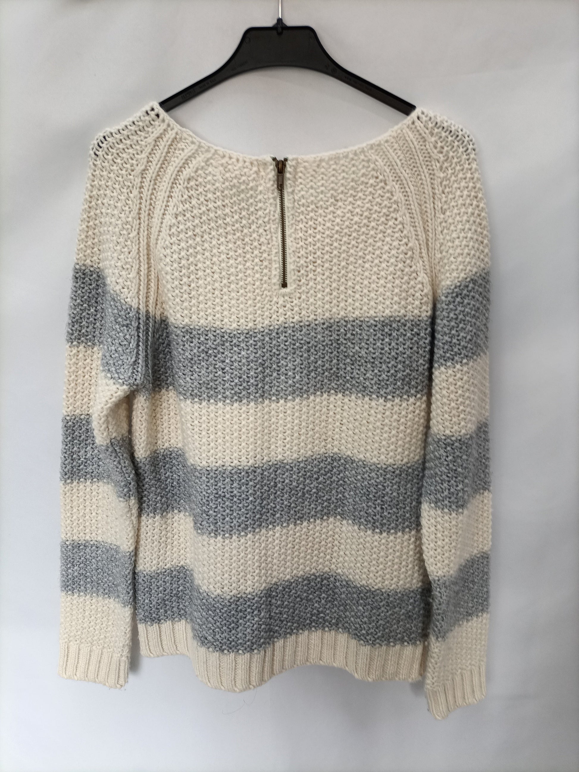 Jersey de rayas azul y beige con detalle de cremallera trasera. largo 59 cm