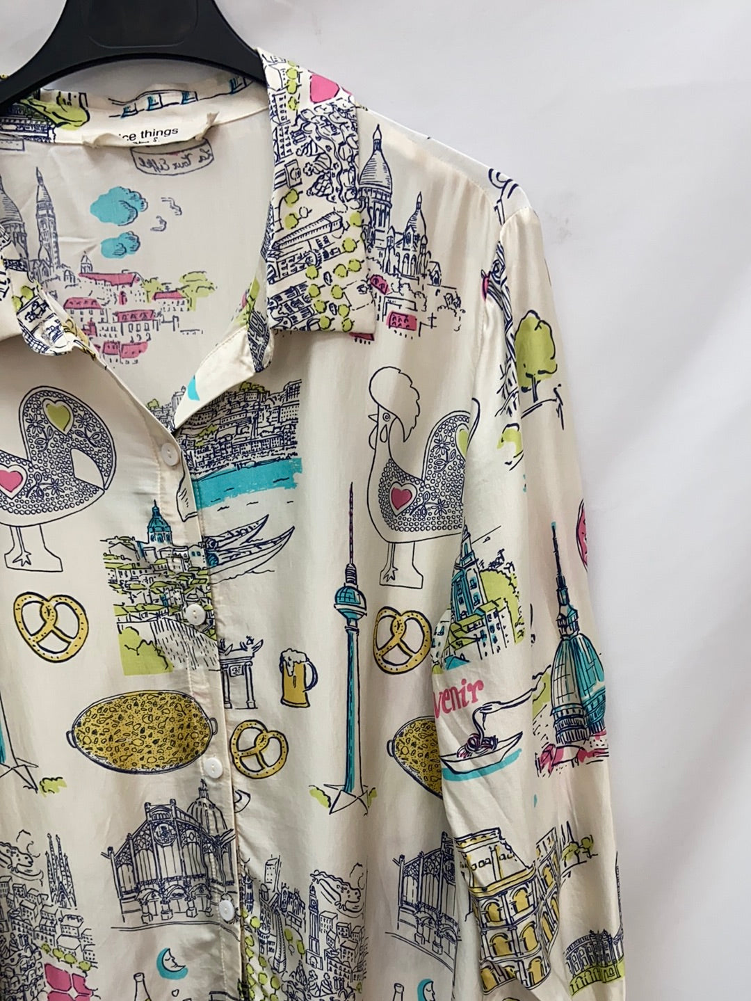camisa beige con estampado de elementos característicos de diferentes ciudades .