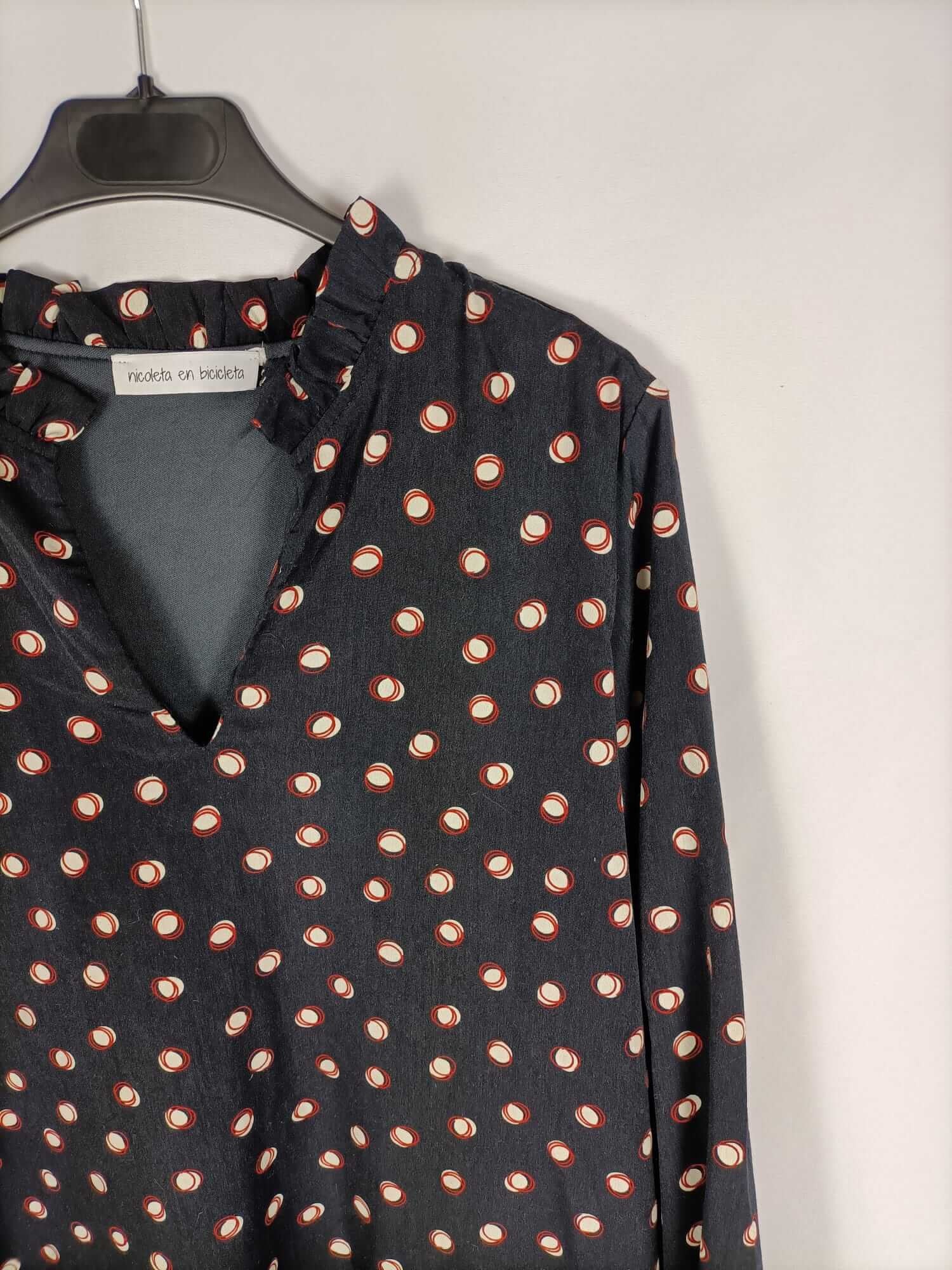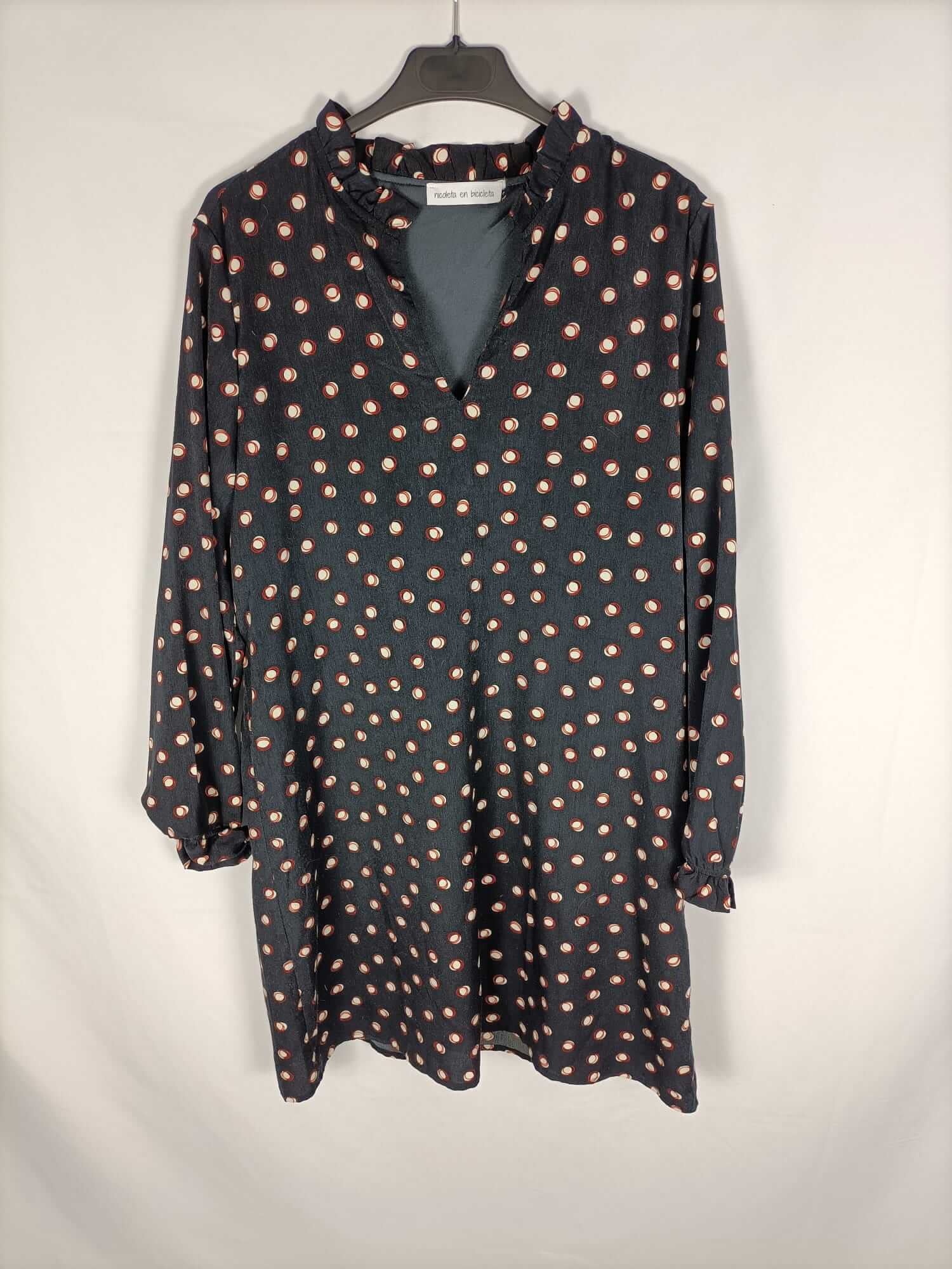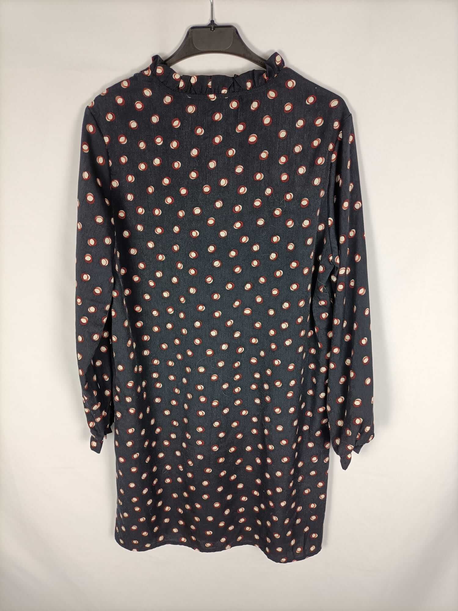 Vestido corto azul con detalle de círculos en tonos rojos y beige. Fluido y no elástico. De sisa a sisa 52 cm largo 90 cm