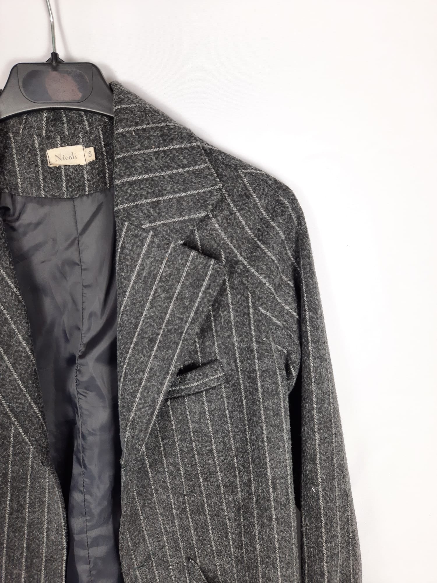 Nicoli. Blazer gris con rayas diplomáticas en blanco. Tejido tipo franela. No elástica. De sisa a sisa 45 cm largo 77 cm