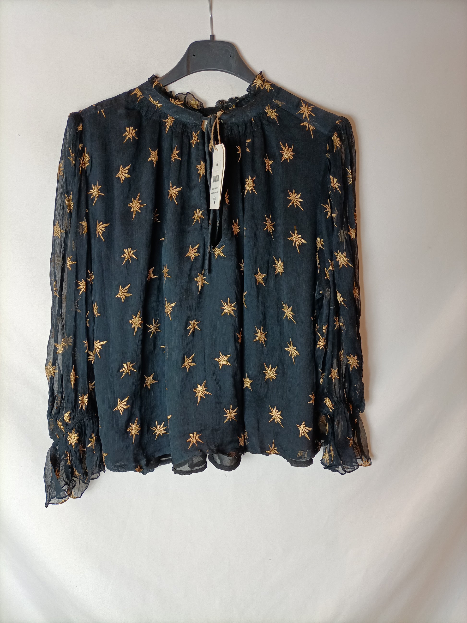 NUEVO CON ETIQUETA. Blusa azul semitransparente con detalle de estampado dorados.