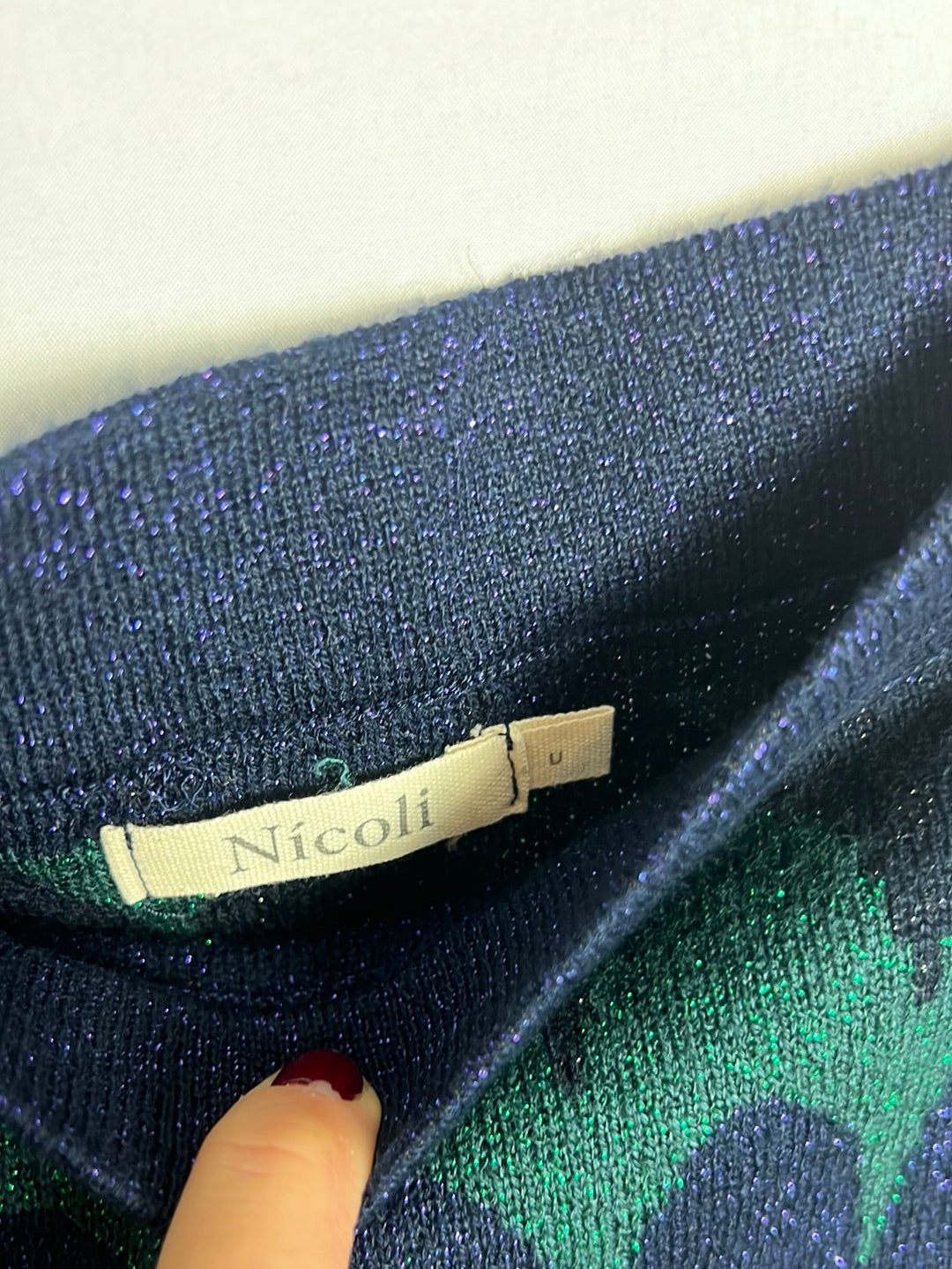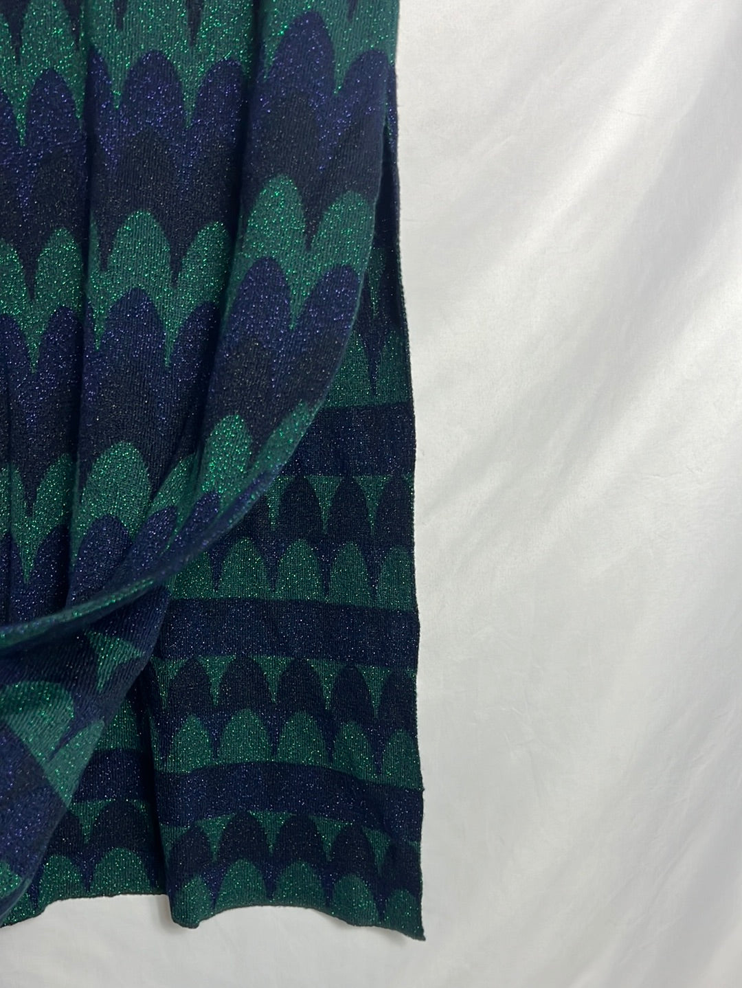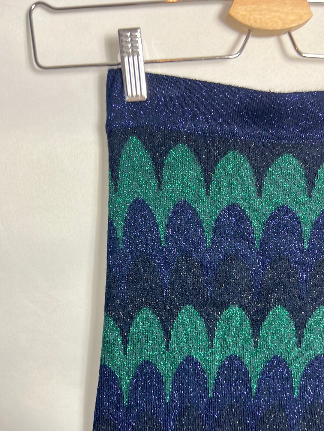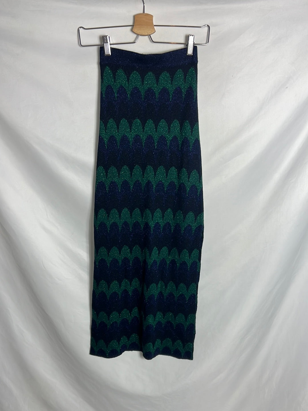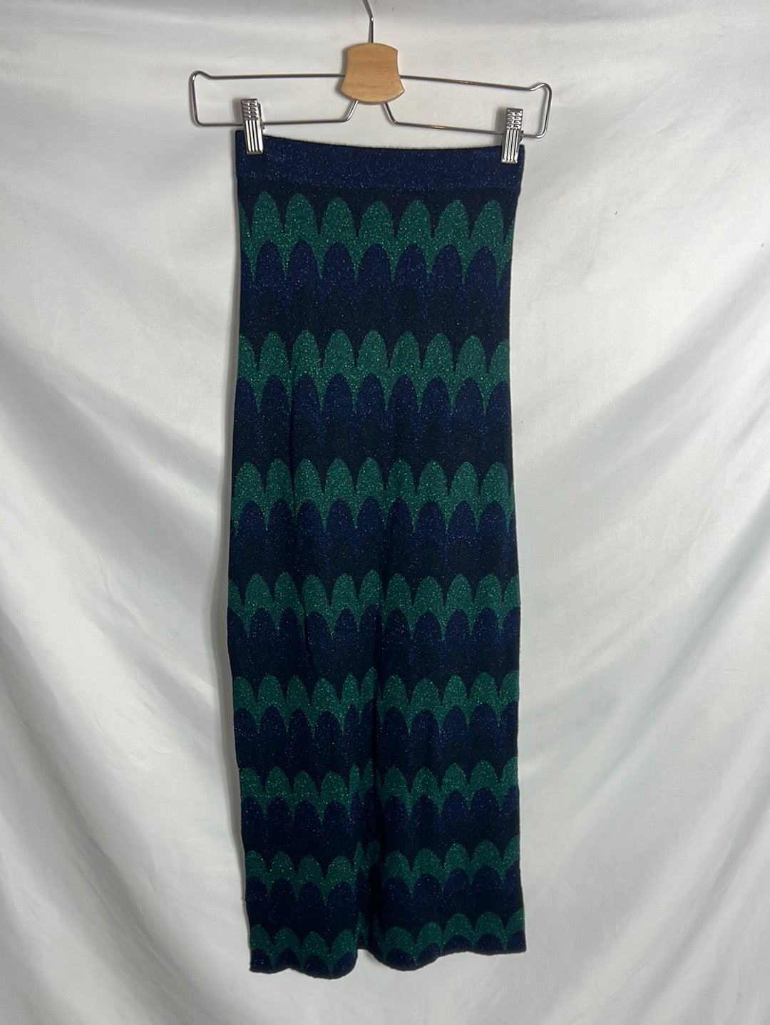 falda de punto verde y azul entallada. Detalle de hilos plateados. Cintura 30cm, largo 98cm Semielastico