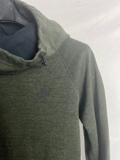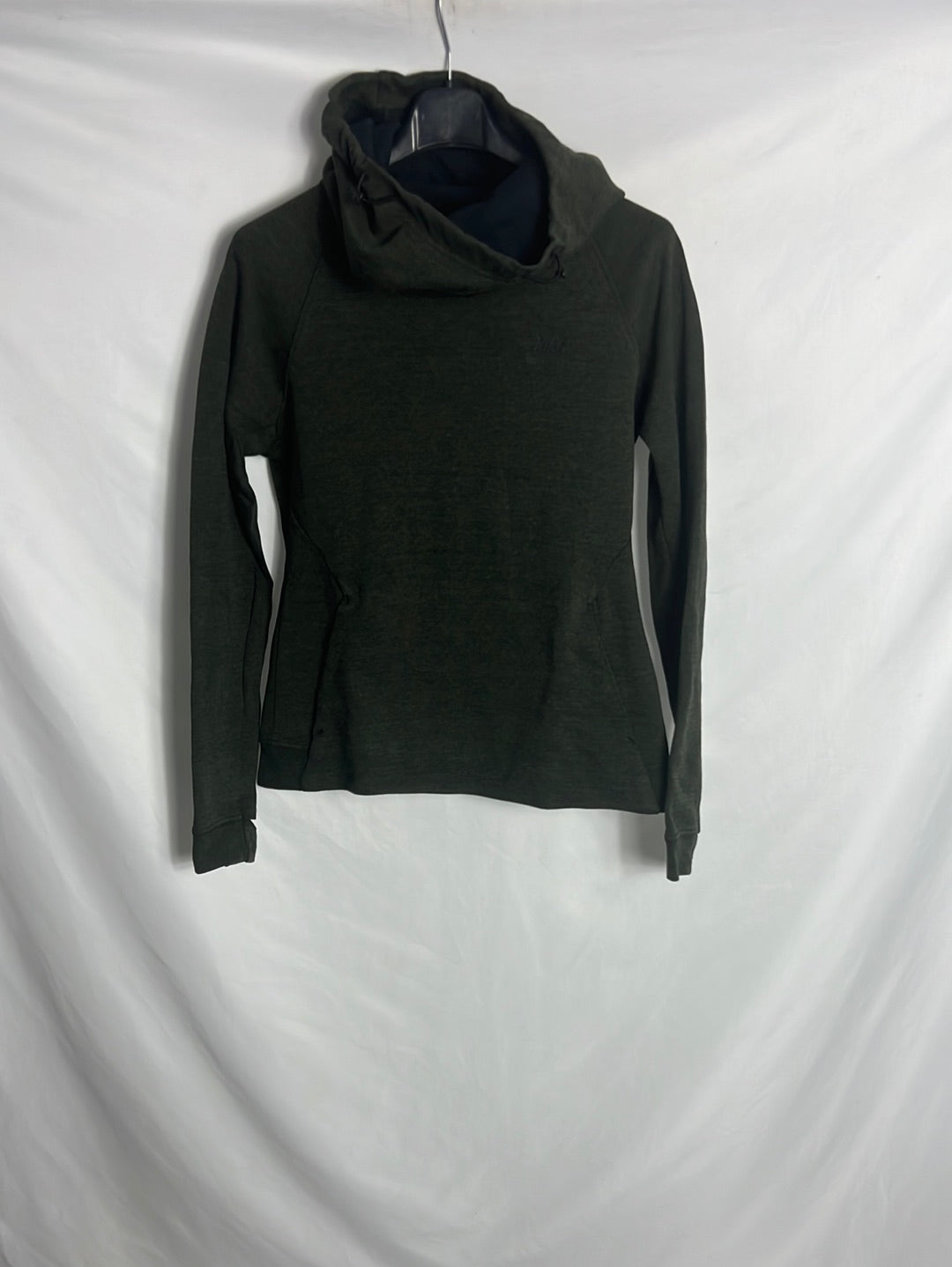 sudadera verde jaspeada con capucha y cuello elevado por delante.
