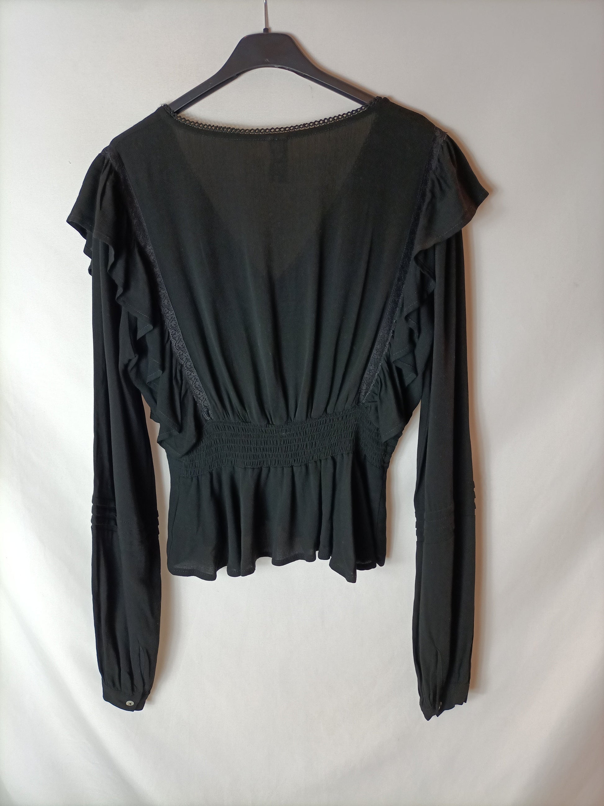 Blusa negra fluida volante. Cintura elástica por la espalda y botones de nácar en la parte delantera.