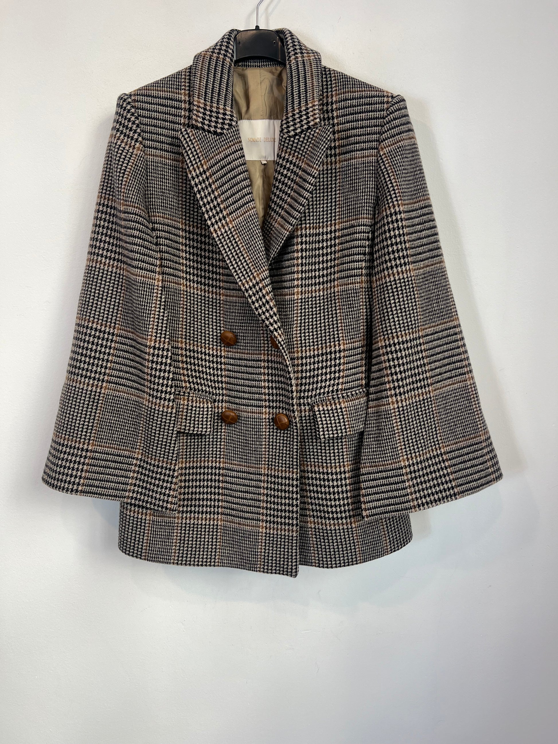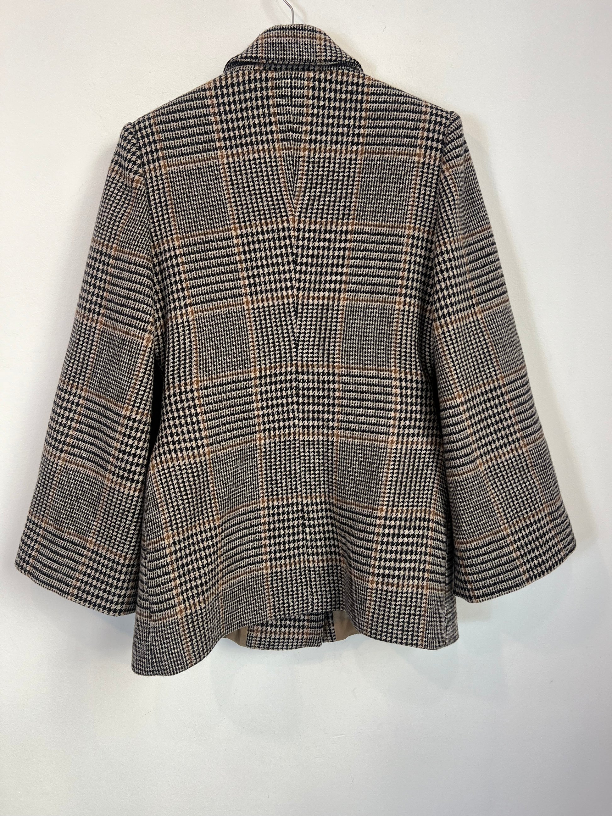 No elástico. Blazer efecto capa con hombreras: Largo 73 cm, de sisa a sisa 46 cm.