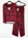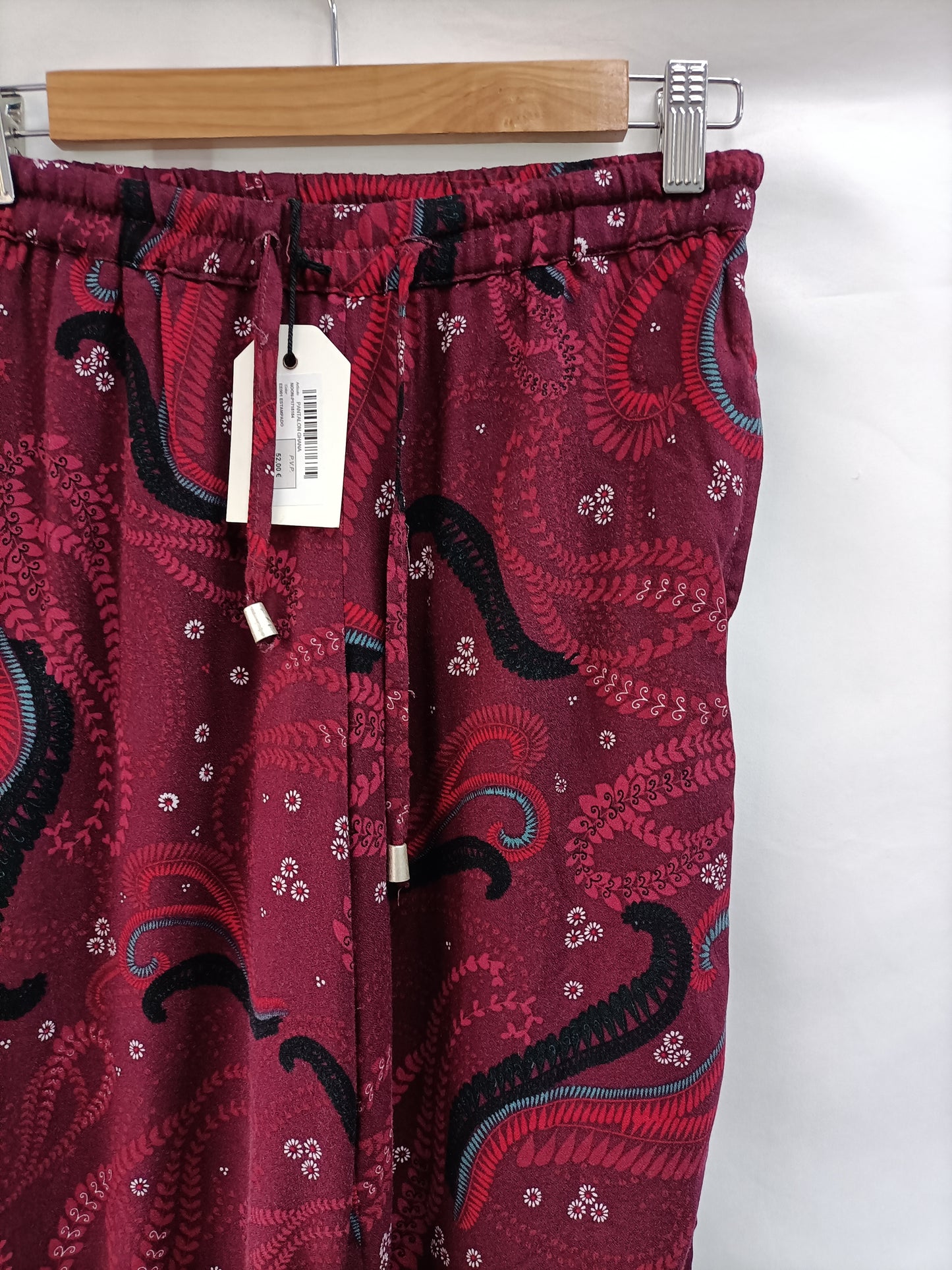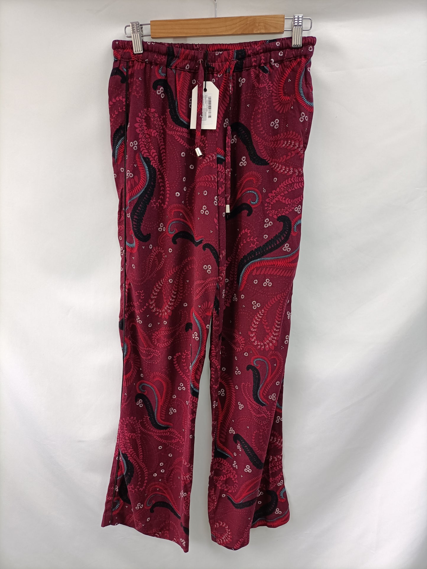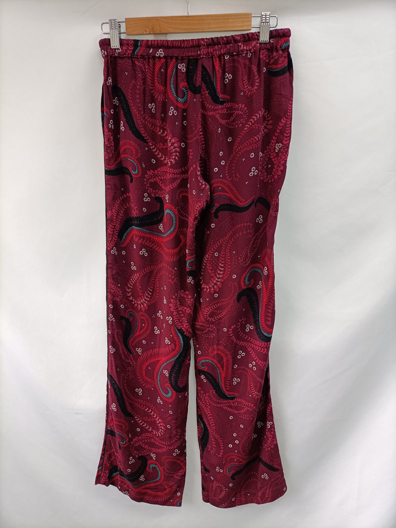 Pantalón fluido burdeos con estampado de amebas en tono negro. Cintura elásticas. Total look con blusa