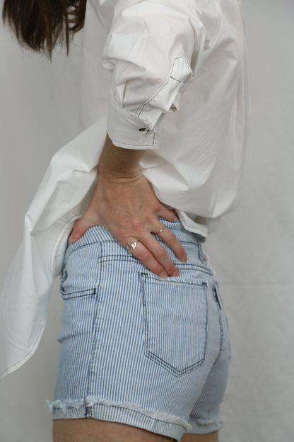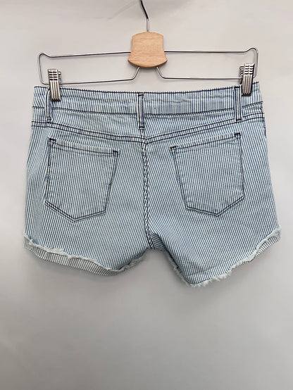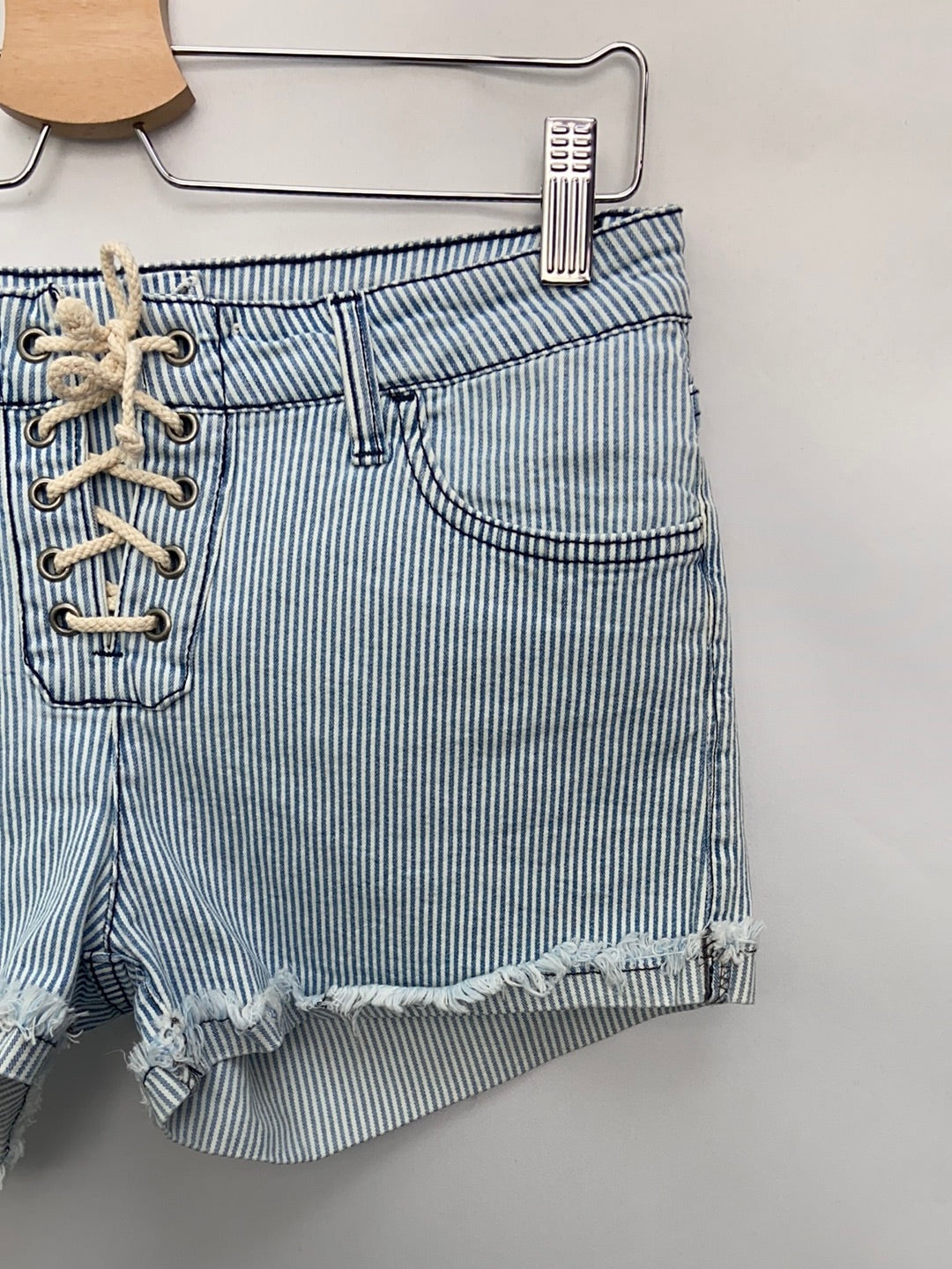 Shorts de rayas blancas y azules clarito de NOON. Se abrocha con botón y cuerda. Doblez abajo.