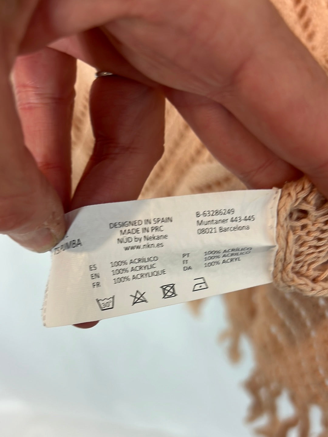 top rosa de punto calado con flecos. Escote pico. Lazada con cinta de cuerda de pompones y abalorios