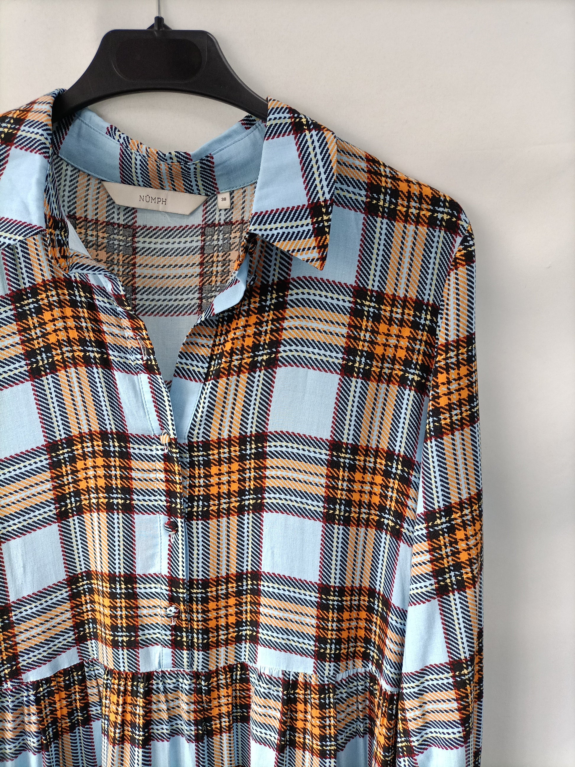 Münph. Vestido largo fluido de cuadros en tonos azules y naranjas. No elástico. De sisa a sisa 50 cm largo 131 cm