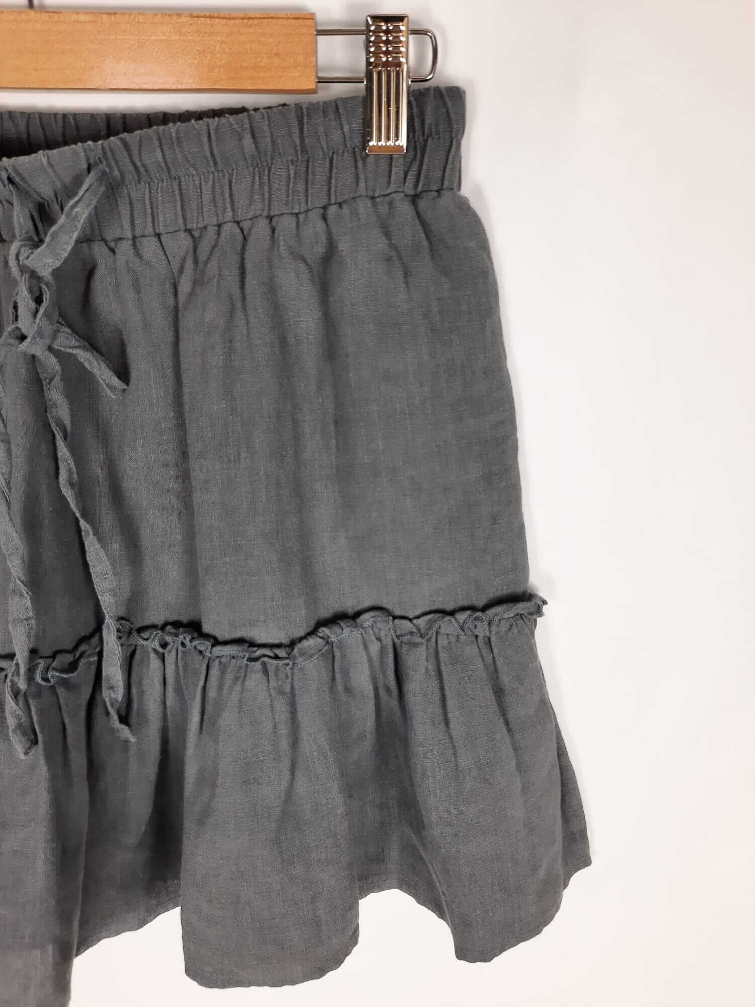 Nunui. Falda corta gris de lino con volantito. Cintura elástica. Largo 38 cm