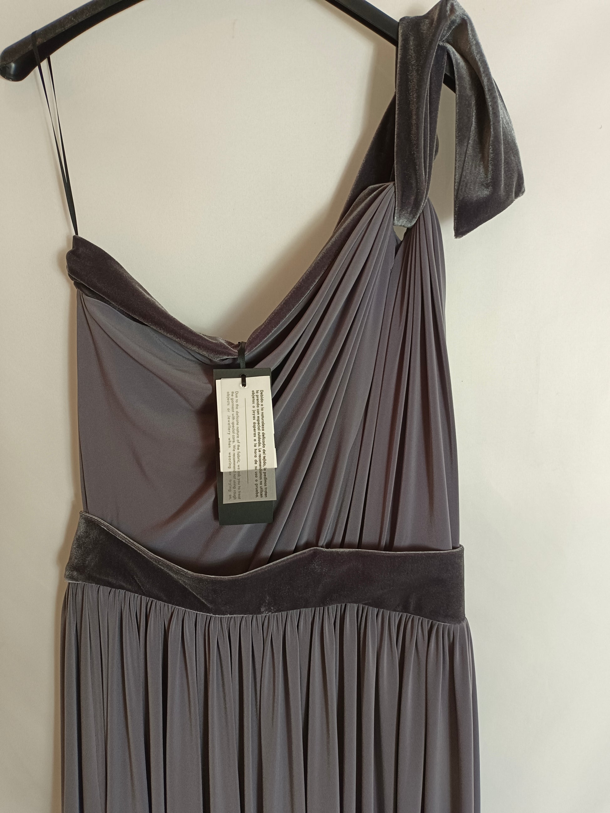 NUEVO CON ETIQUETA. Vestido largo gris con detalle en terciopelo y escote asimétrico.