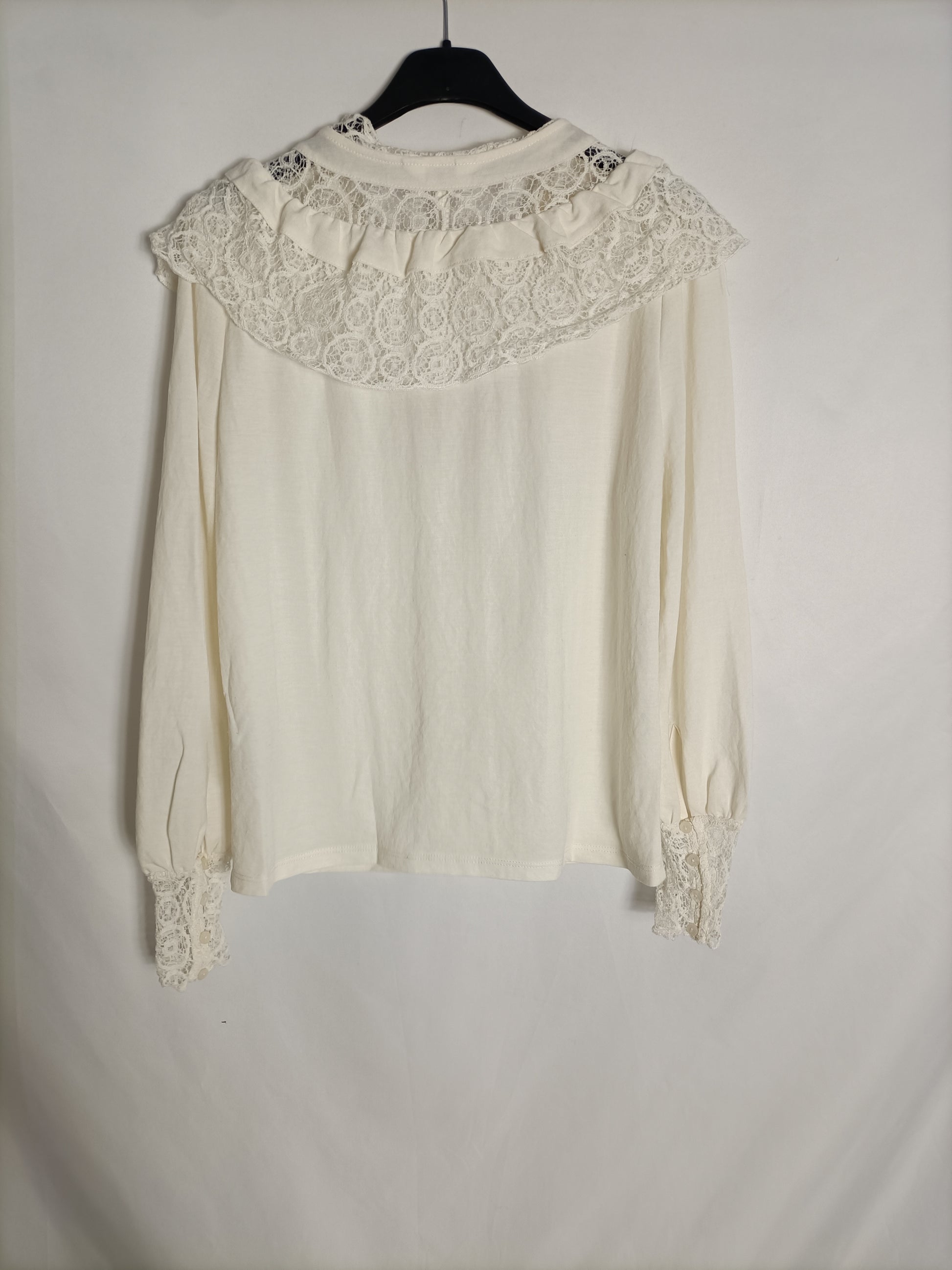 blusa blanco roto abotonada con encaje. De sisa a sisa 44 cm y largo 53 cm